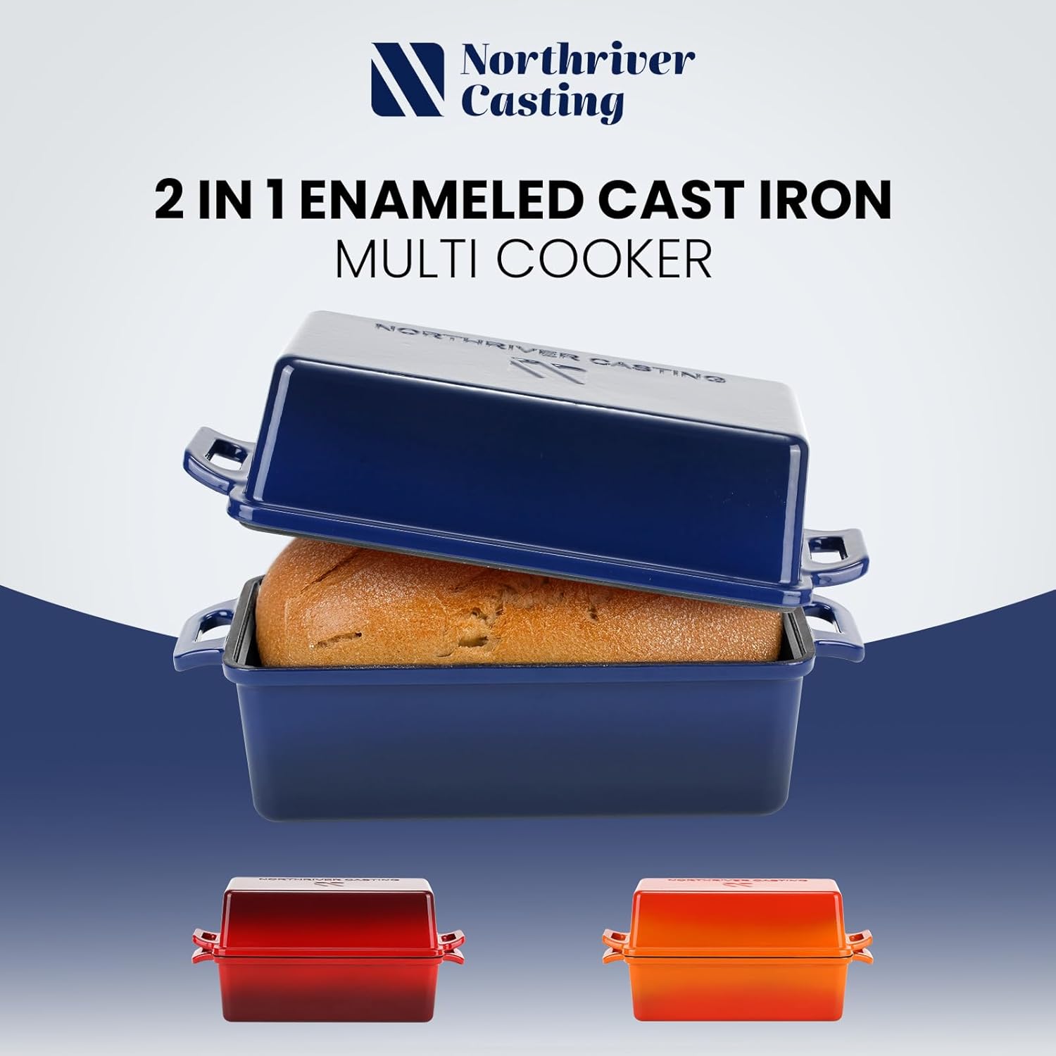2 in 1 Enameled Cast Iron Bread Pan with Lid, Perfect Bread Oven, Loaf Pans for Baking Homemade Sourdough Bread 9x5, 2 Piece set, Navy Blue