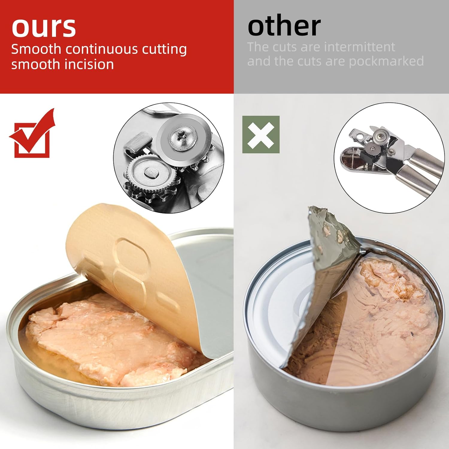 - Sturdy Construction: Built with durable materials, this can opener is made to last through countless uses. Food safety High strength high hardness alloy high carbon stainless steel cutting blades stay sharp, suitable for opening cans of all sizes and can be safely in direct contact with food. After use, it can be cleaned in the sink or dishwasher, stainless steel tableware will never rust, and it will be a reliable tool in your kitchen for years to come