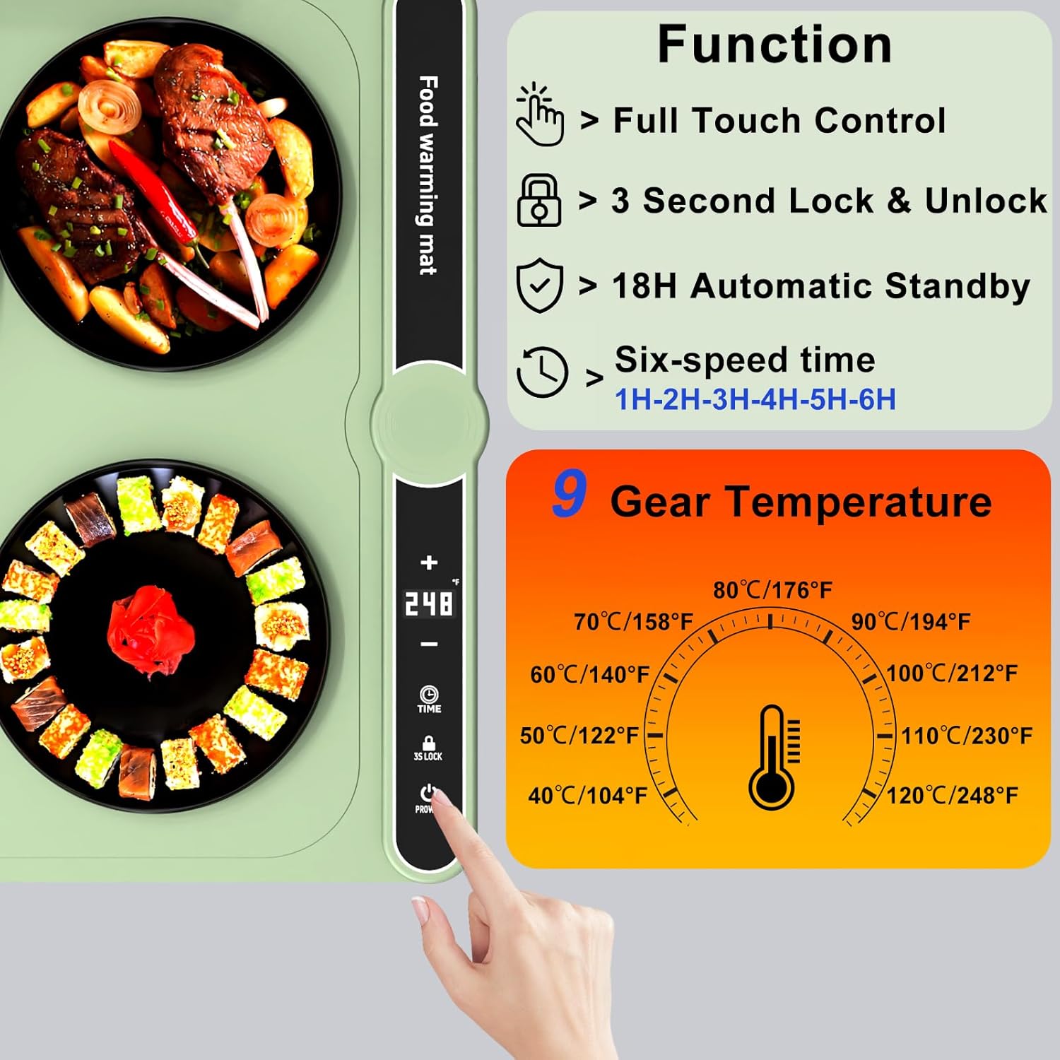 Warming Mat for Food, Rollable Electric Warming Trays for Food with 9 Temperature Settings, Heating Fastly in 10S, Food Warmer Using for Buffets Party and Home Daily, Green