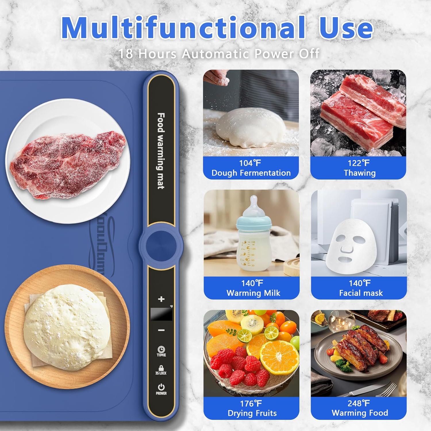 - 【Child Locks and Safety Guards】Our food warming mat has a double protection function. The built-in child lock function can safely lock the panel buttons to prevent children from accidentally touching and protect curious little hands; when you use it continuously for 18 hours, the warming plate will automatically trigger the power-off protection mechanism to ensure the safety of use; Non-slip feet on the bottom prevent accidental sliding and speed up heat dissipation to protect your desktop