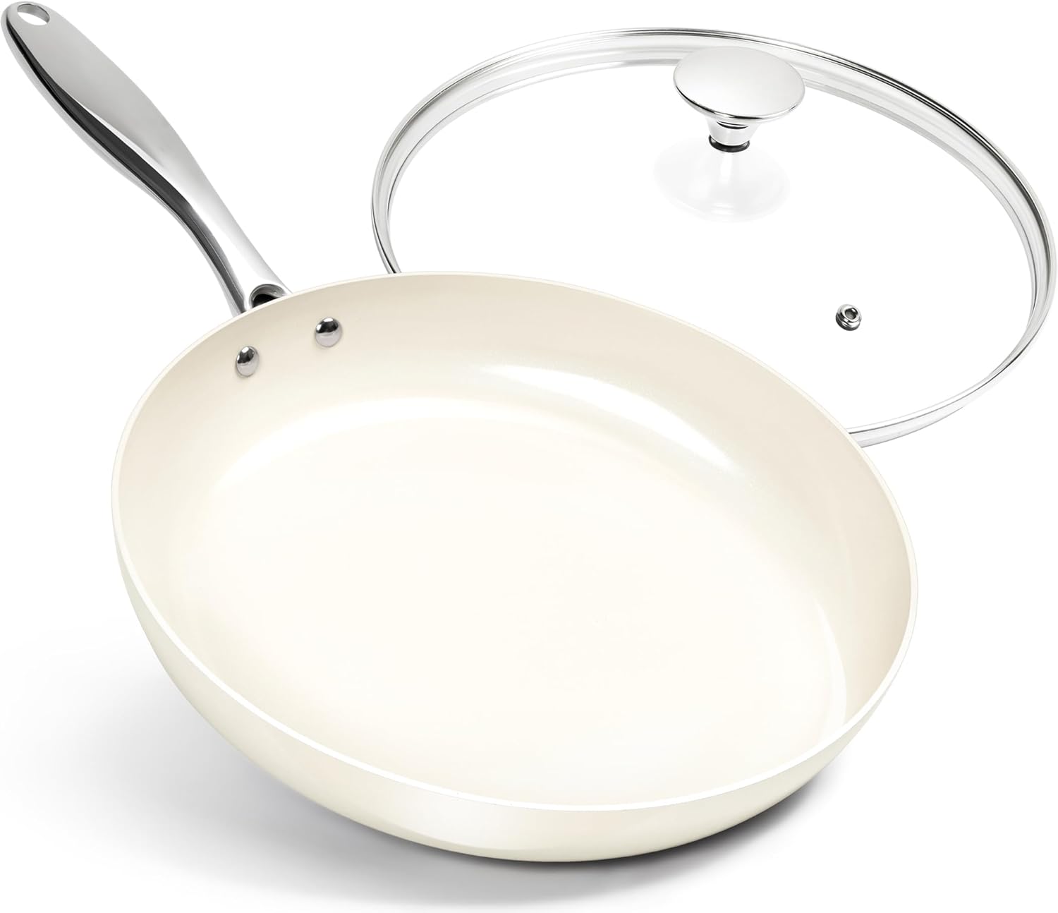 - Even Heat & Versatile Stovetop Use - Featuring an alloy base, this ceramic nonstick frying pan provides fast and even heat distribution for quicker cooking. Compatible with gas, electric, and induction stovetops, this versatile skillet with lid is ideal for any kitchen.