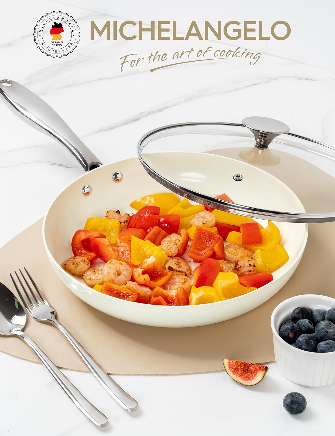 MICHELANGELO Small Frying Pan with Lid, 8 Inch Non Stick Fry Pan, Non Toxic Ceramic Skillet, Oven Safe, Induction Compatible, White