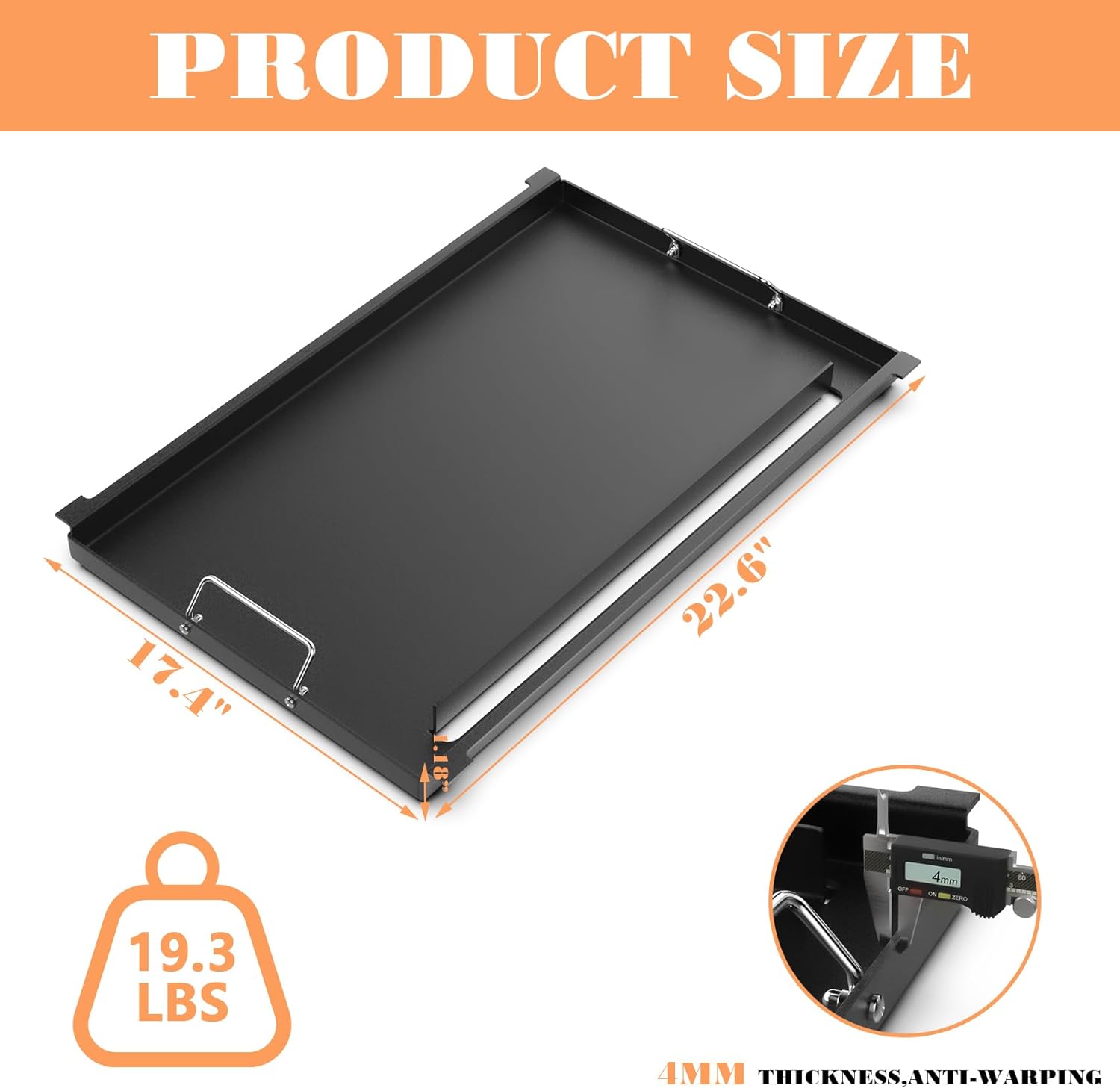 - Product size: 22.6" x 17.4" grill griddle repalcement parts. package includes: 1* Non-stick Carbon Steel griddle and 1*Handles. Materials: Non-stick Carbon Steel. Our grill accessories have excellent heat retention properties so that you could have a wonderful grilling experience while cooking.