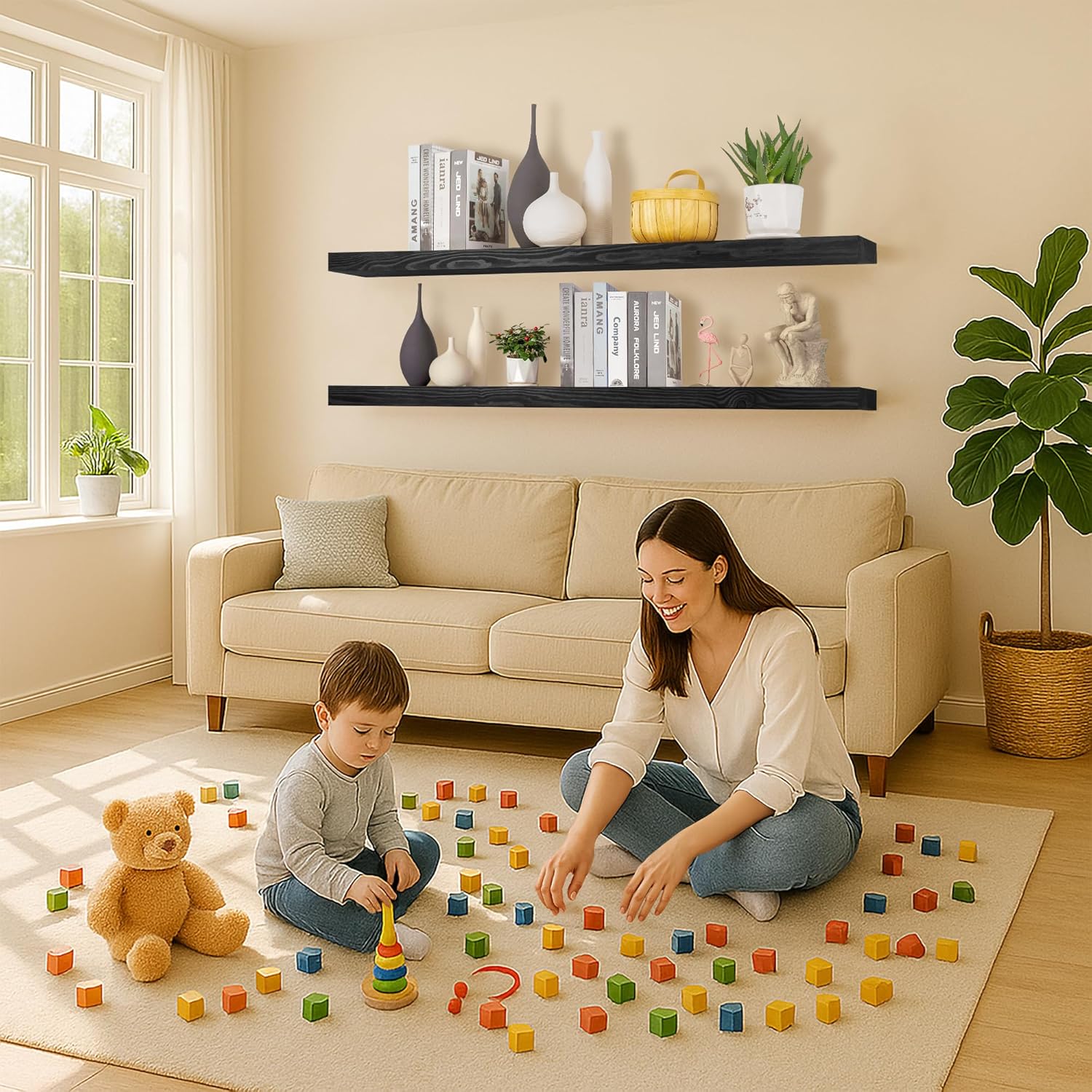 Rustic Floating Shelves 72 inch Long 8 "deep Set of 2, Heavy Duty Wood Wall Mounted Shelves for Bathroom Living Room Kitchen,Book Shelves with Thickened Hidden Bracket- Black