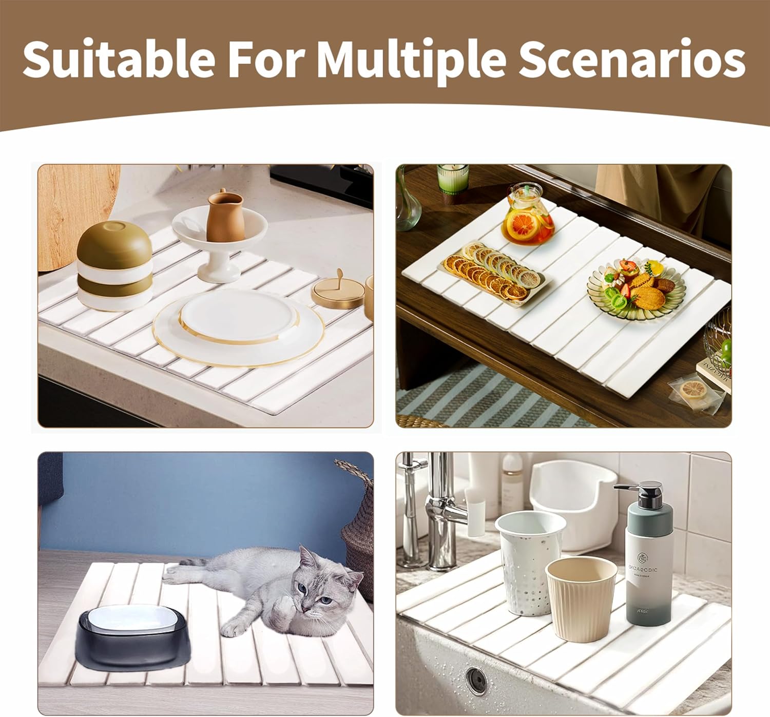 - Foldable Design for Convenient Storage: Quick dry dish mat is their simple and foldable design. When not in use, they can be easily folded and stored in a drawer or cabinet, saving valuable kitchen storage space. This compact, versatile option is ideal for those with limited countertop or storage room, making it a practical choice for any household