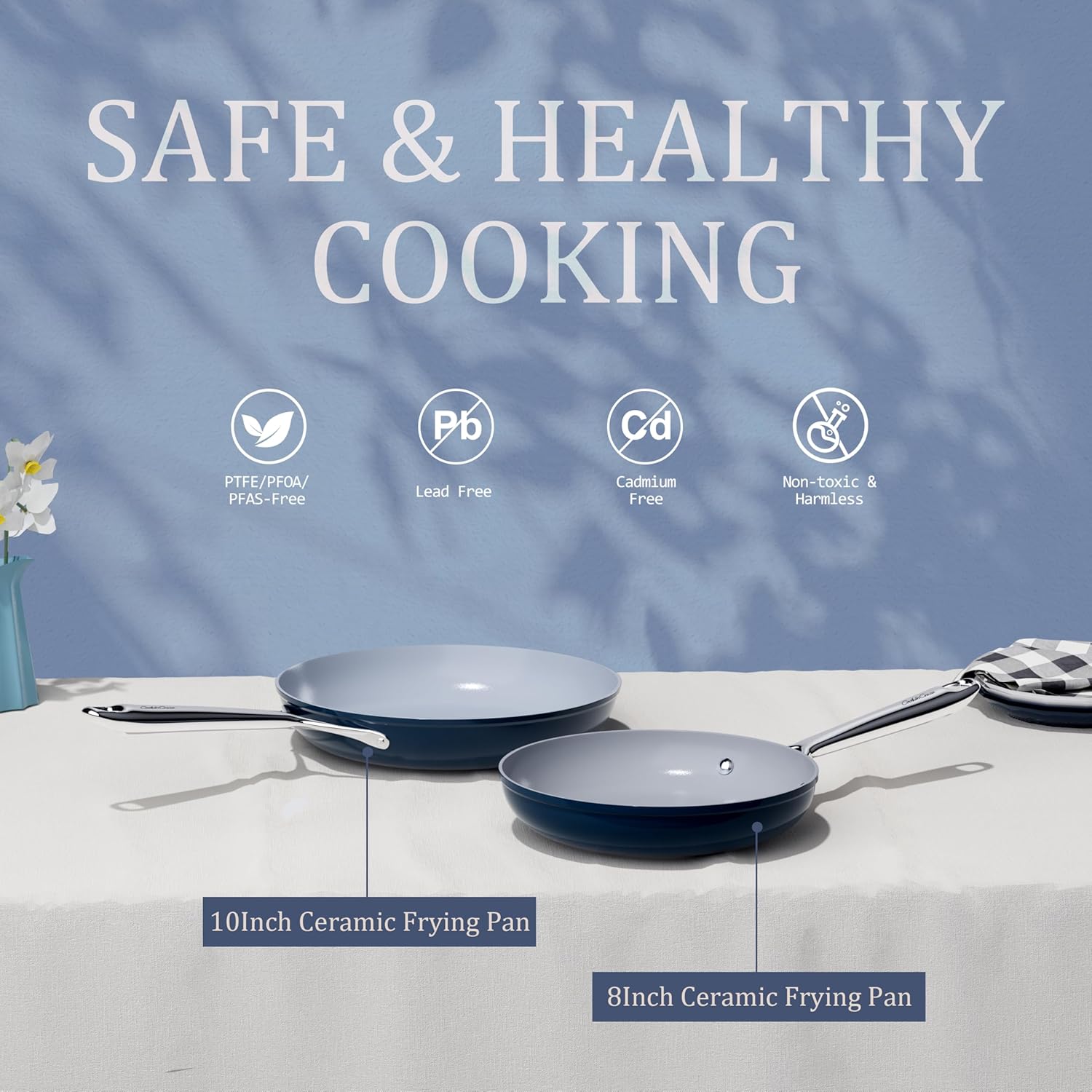Nonstick Ceramic Frying Pan 10 Inch for Induction Cooktop - Non Toxic, PTFE/PFOA/PFAS Free, Oven & Dishwasher Safe up to 500ยฐF - Non Stick Small Skillet with Stay-Cool Handle - Navy Blue
