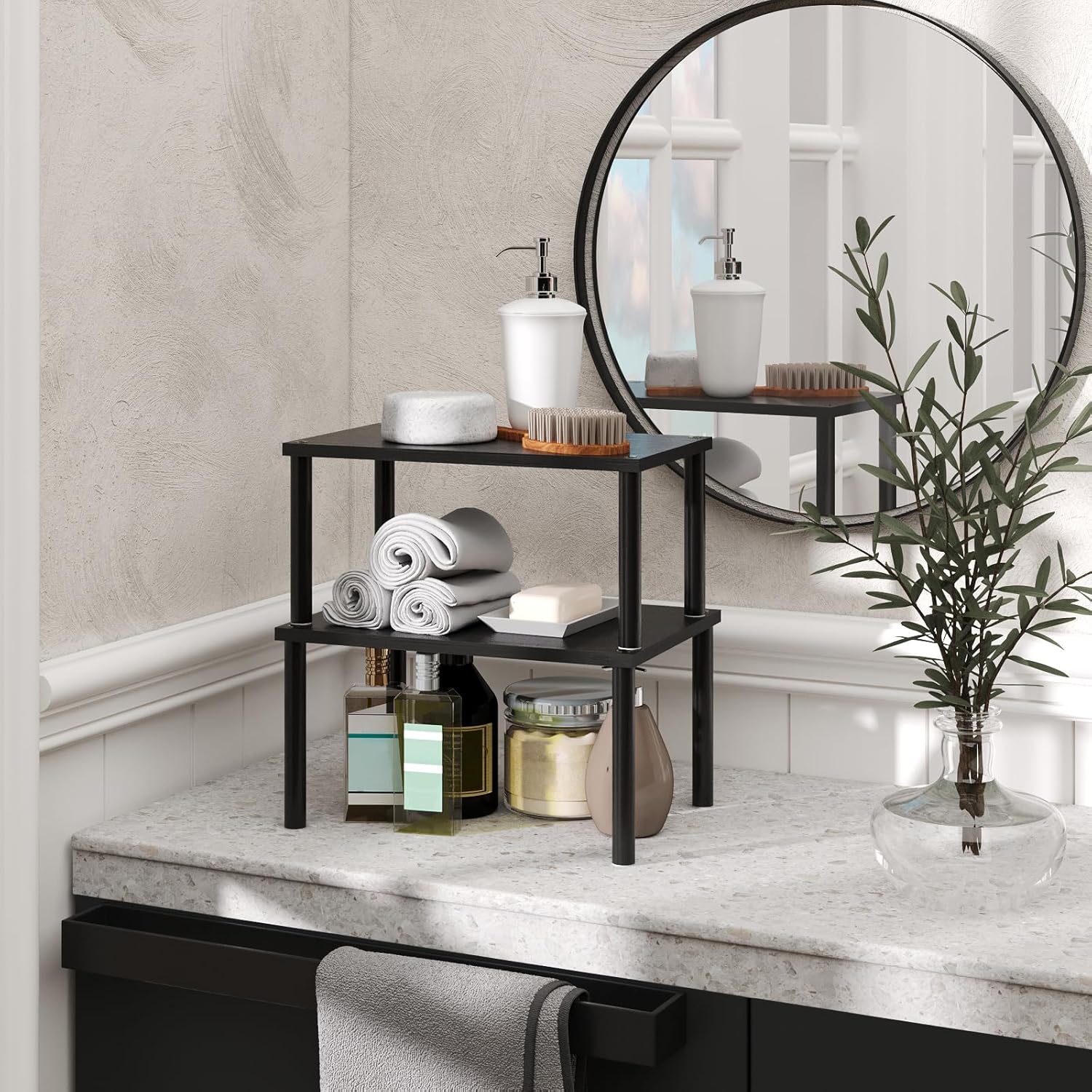 Cabinet Organizer Shelf(Set of 2),Kitchen Counter Shelves,Bamboo Spice Rack Countertop and Cabinet,Stackable Expandable,Medium(Black)