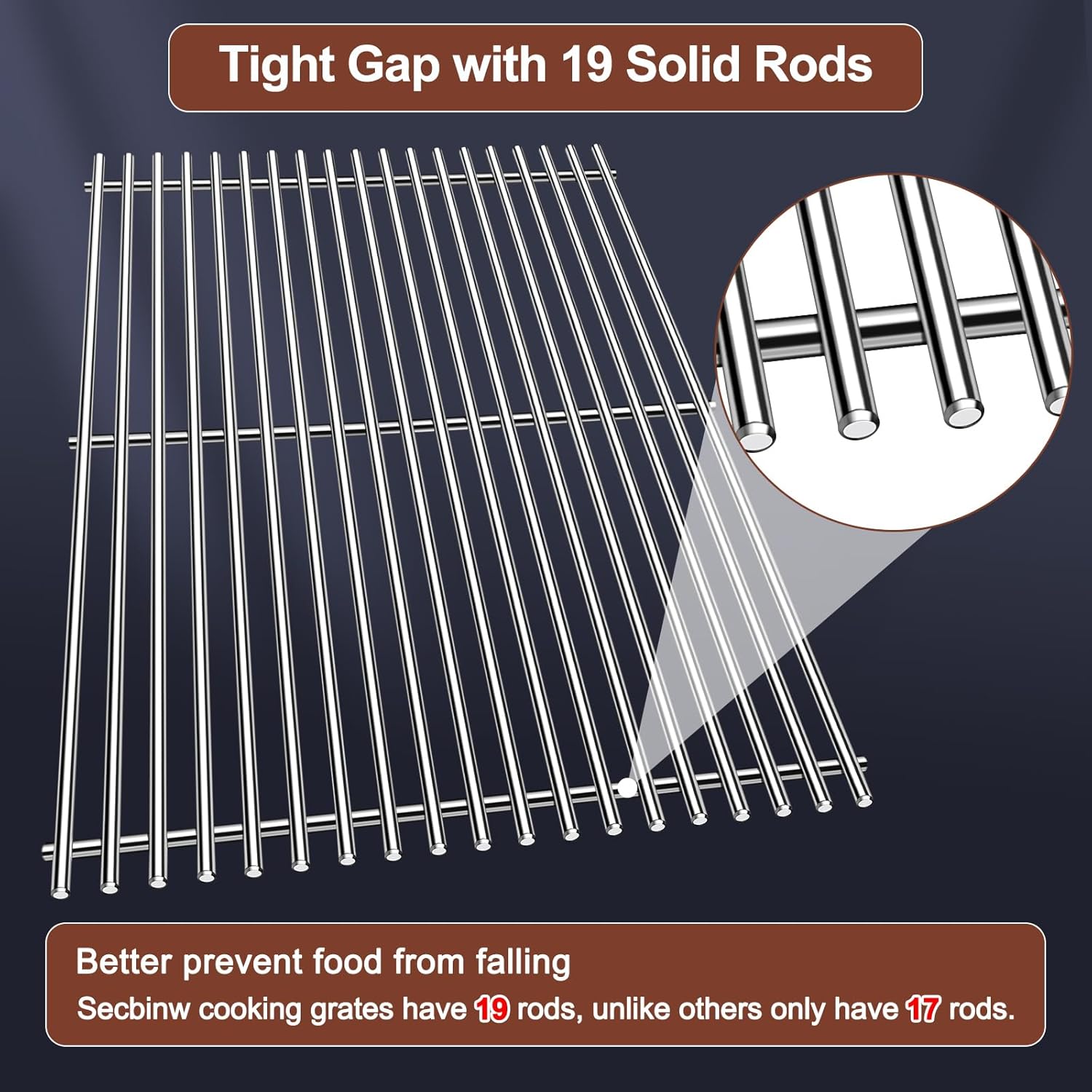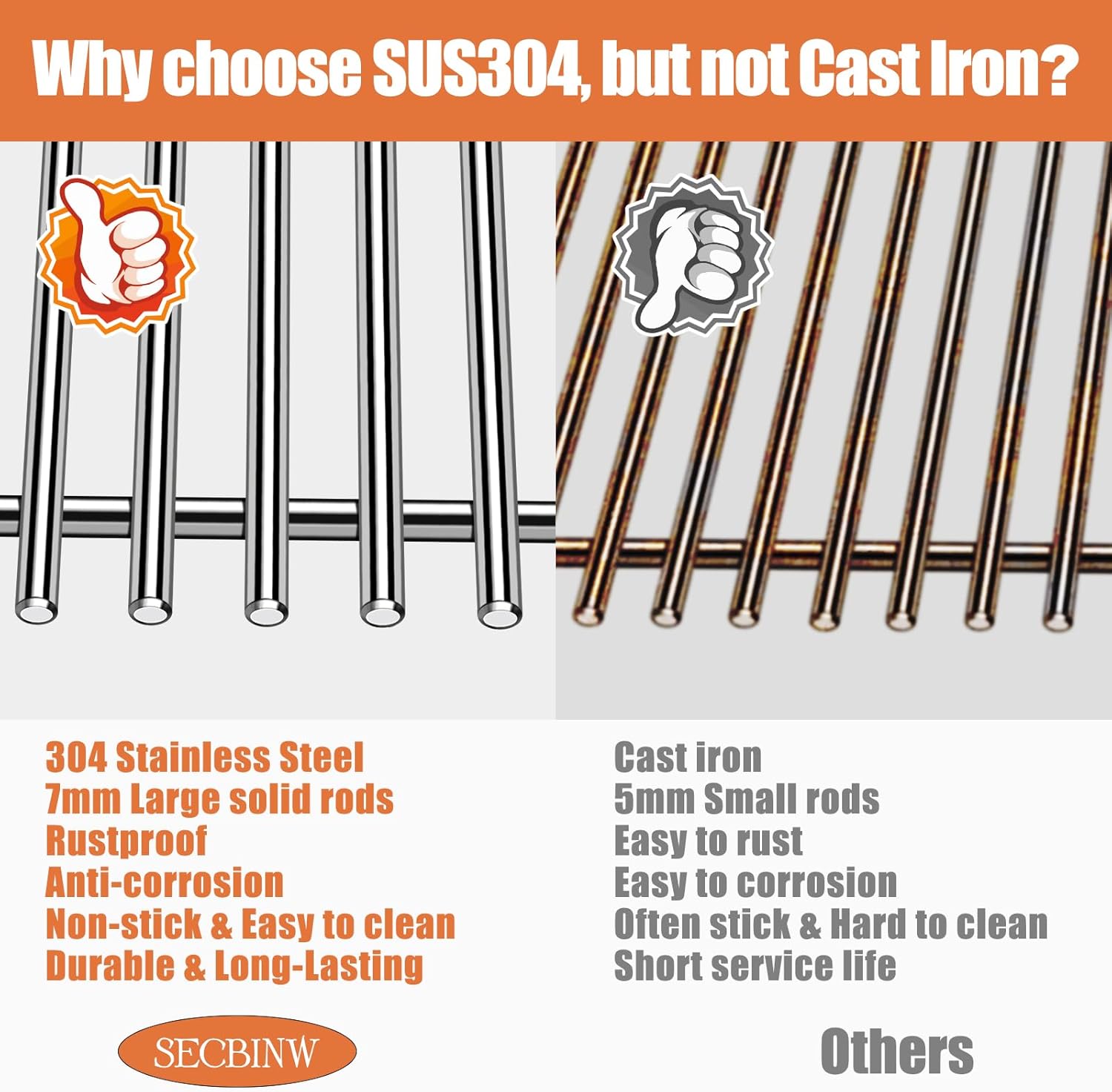 - 【Safe Material & Protect Your Hands】Secbinw grill replacement parts are made of high-quality 100% food grade 304 heavy stainless steel and well-engineered to prevent rust, which is durable with uniform heating and high corrosion resistance, much more heavier and heavy duty. Our cooking grill grate with edge grinding design is free of sharp edges, made with nice welds and smooth surface, no sharp edges and will not hurt your hands. Best choice for your weber genesis ii grills.