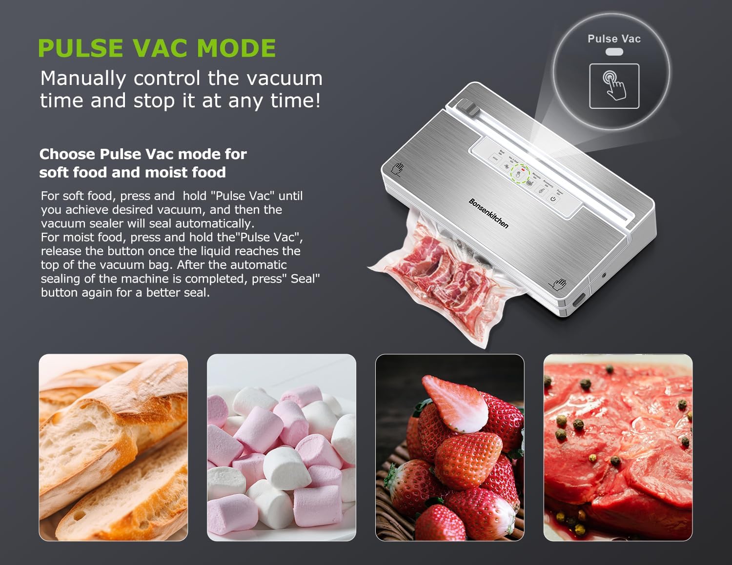 - FAST & EFFICIENT:Equipped with unique airtight technology, Bonsenkitchen vacuum sealer machine vacuum seals 40 bags continuously in just 15 minutes. Achieve professional-grade suction to lock in freshness, prevent freezer burn, and extend food shelf life. Ideal for meal prep, sous vide, and bulk storage