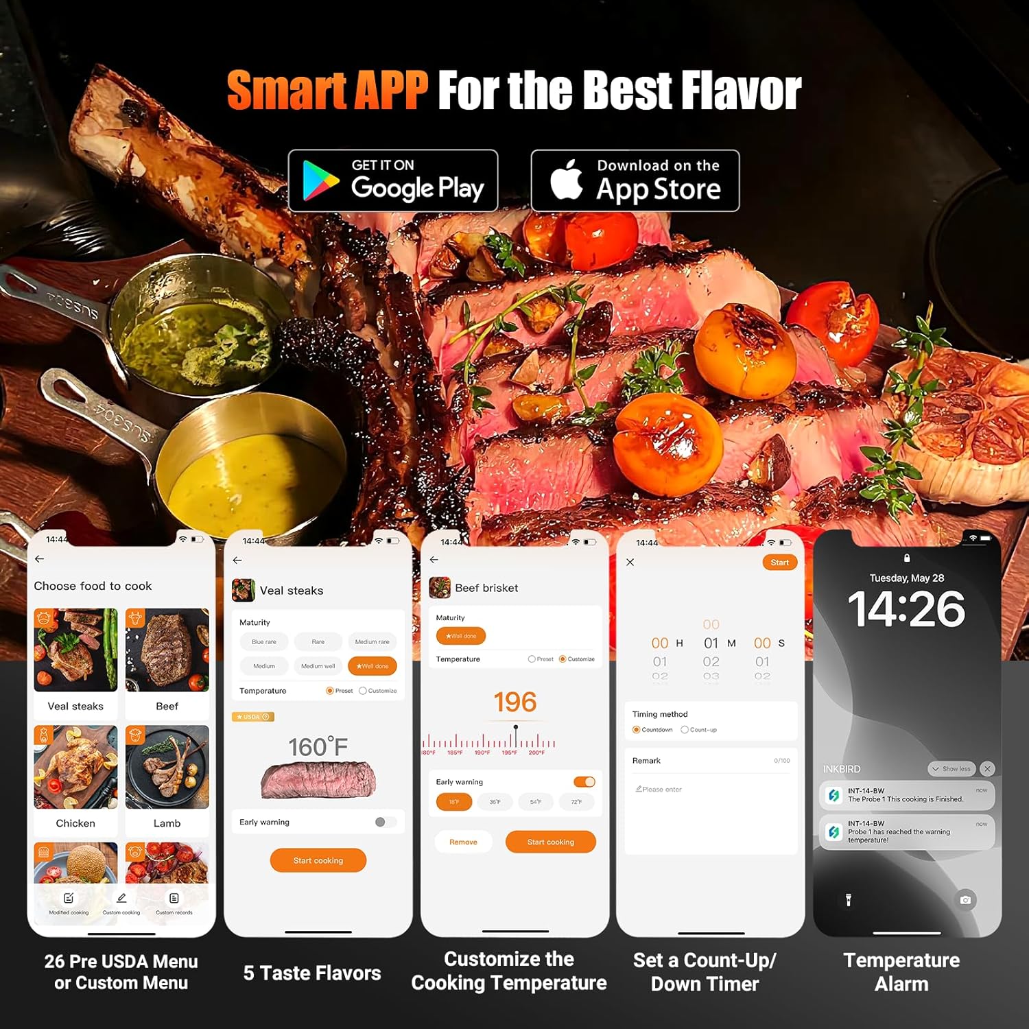 - INKBIRD's First Ever Three-Mode Operation: The INT-14-BW is the first BBQ thermometer to feature 2.4GHz WiFi, Bluetooth 5.4, and local offline operation. In WiFi mode, you can remotely control and monitor the cooking process on your smartphone from the office. In Bluetooth mode, you can relax in the living room while the grilling is in progress and receive a notification on your smartphone when the grilling is complete. And in local mode, you can fully indulge in the barbecue party with your family and friends! WiFi/Bluetooth/Local, three modes to use for smart and convenient cooking anytime, anywhere
