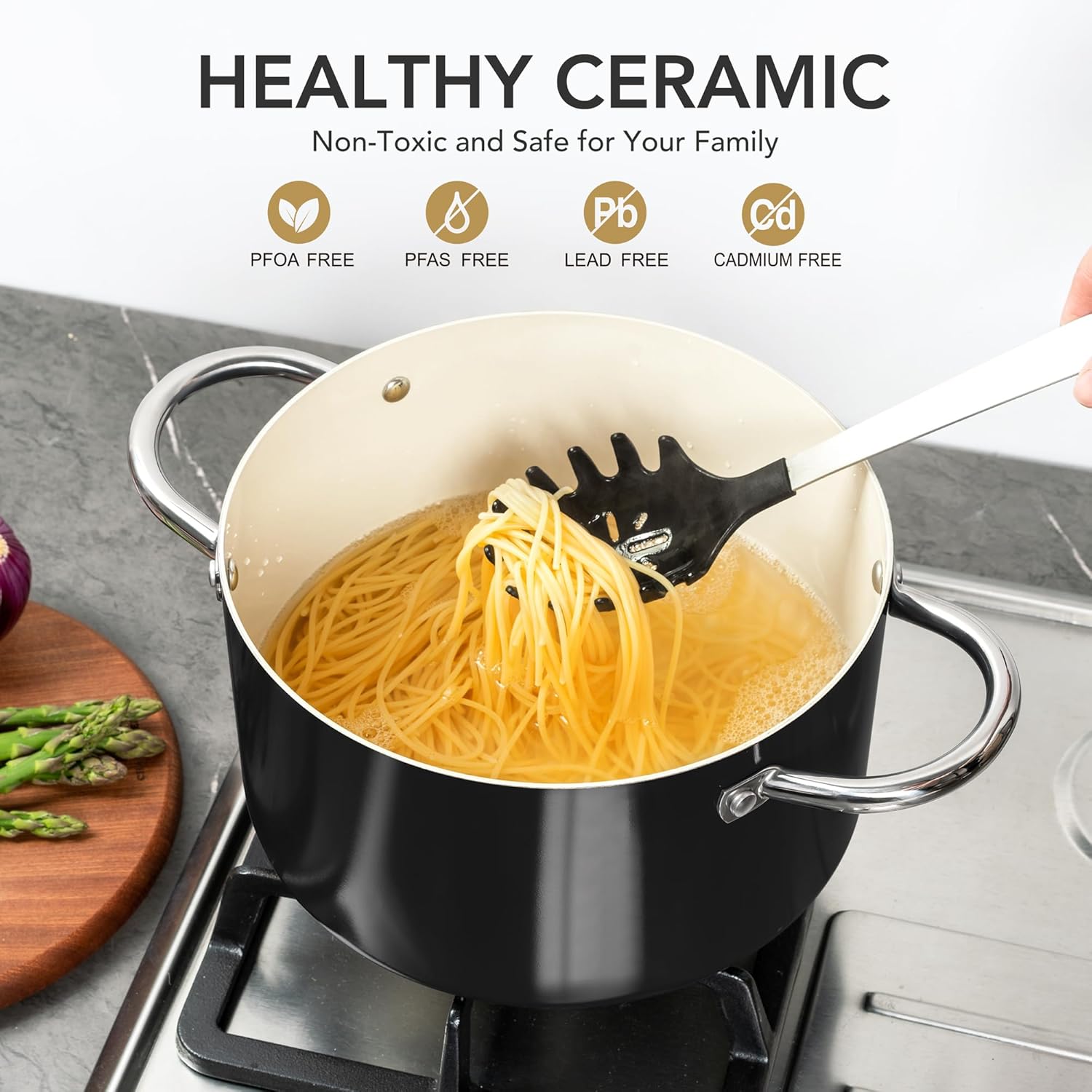 MICHELANGELO Stock Pot with Lid, 6 Quart Cooking Pot with Ceramic Coating, Nonstick Ceramic Soup Pot with Lid, Induction Compatible - 6QT Stockpot, Black