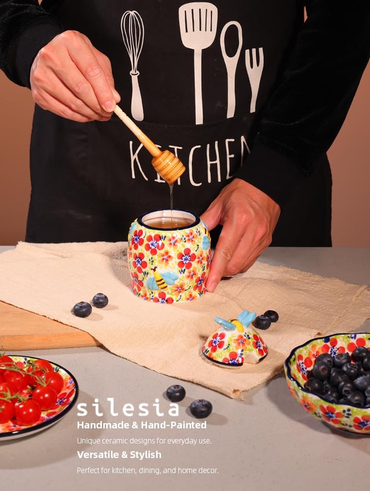 - Artistic Hand-Painted Design: The honey jar features an intricate, hand-painted design, making each piece unique. The vibrant patterns and colors add a charming and rustic aesthetic to your kitchen or dining area, doubling as a decorative accent when not in use
