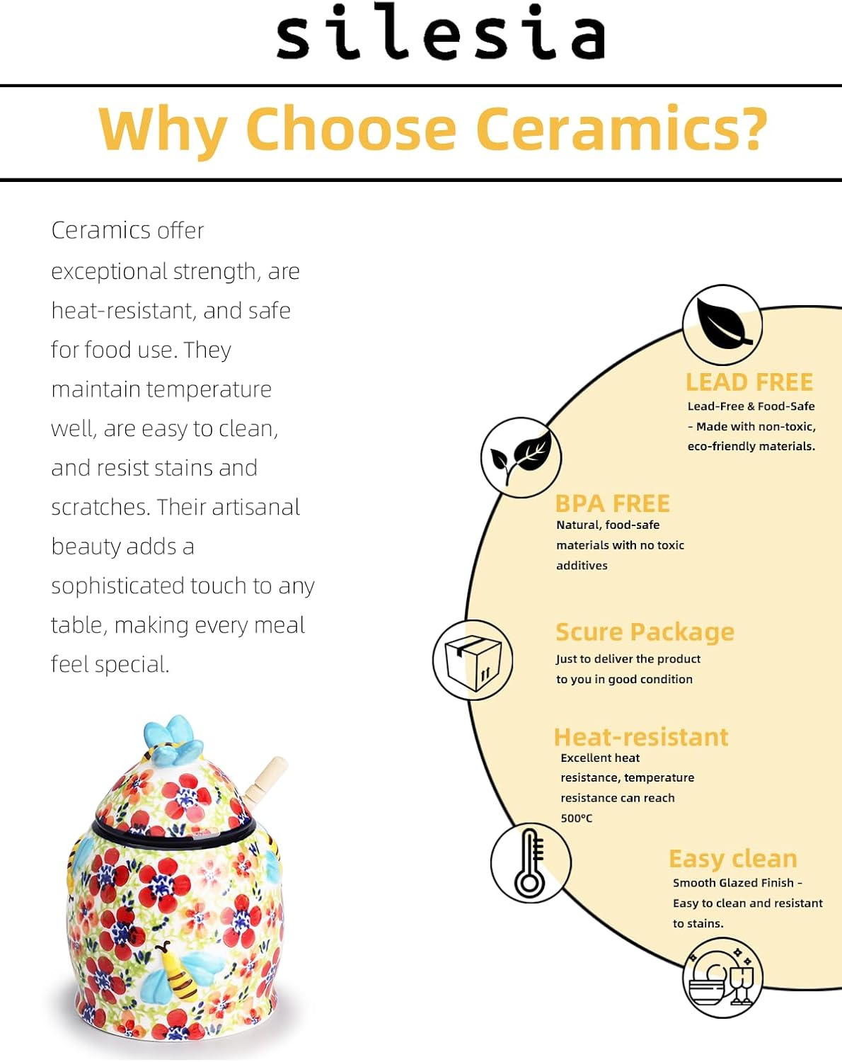 - Ceramic Materials: Crafted from lead free ceramic, this honey jar is built to last. it remains beautiful and functional over time. The smooth glaze also makes it easy to clean and maintain