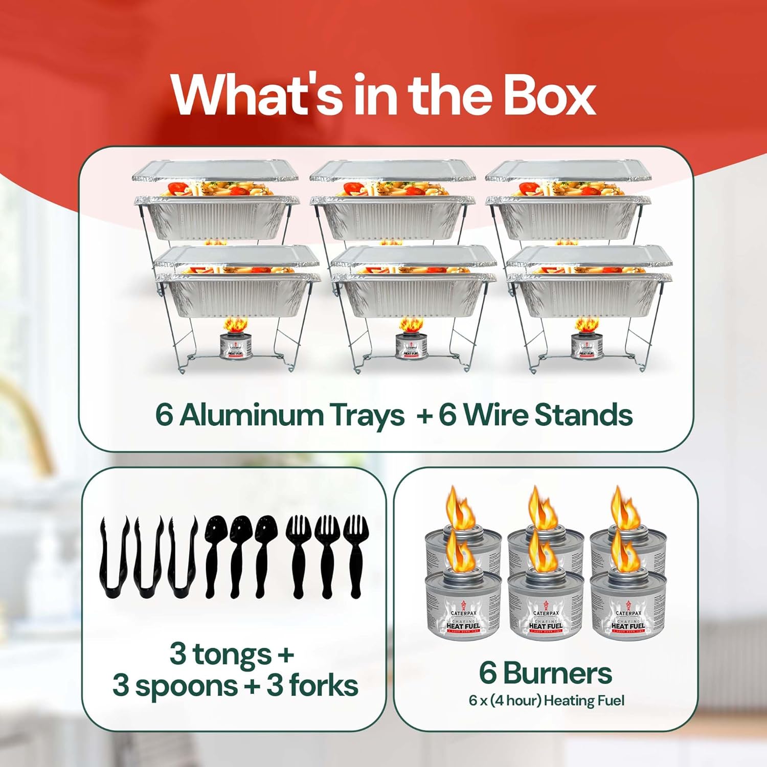 - 39-PIECE DISPOSABLE CHAFING DISH SET FOR BUFFET CATERING EVENTS: Everything you need in one box: includes 6 foldable wire racks, 6 half-size food pans (9x13”), 6 water pans, 6 lids, 6 fuel cans, and 9 serving utensils — the ultimate disposable buffet set for effortless hosting and professional presentation.