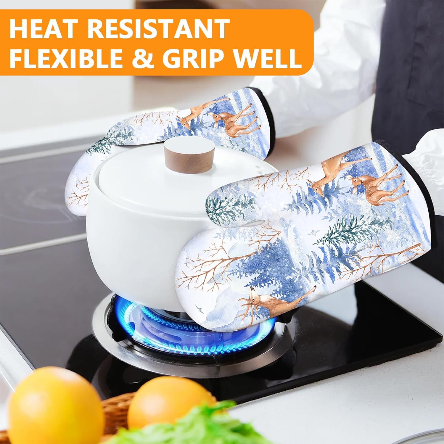 Deer Mitts and Pot Holders Sets 4Pcs,Extra Long Oven Gloves Potholder for Kitchen Cooking Baking BBQ 100% Cotton Heat Resistant