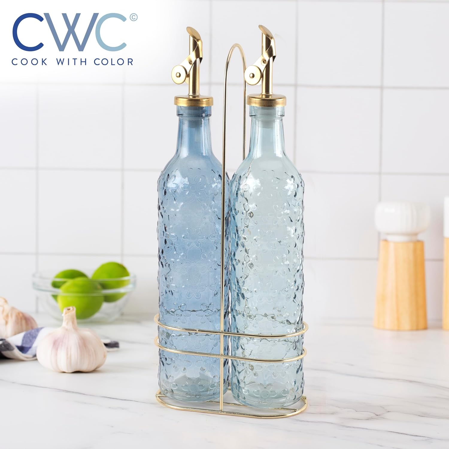 - Beautiful and Functional - Our colored glass oil dispensing bottles, with elegeant colors, gold tops and gold wire rack, will elevate your kitchen. Don't use just any oil bottle, upgrade the way you cook. That's our mission.