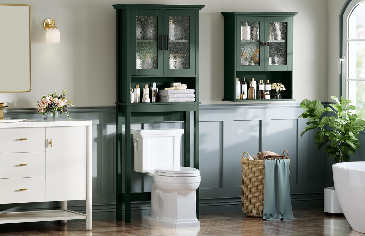 Bathroom Cabinet Wall Mount, Medicine Cabinet Over Toilet Storage Cabinet with Glass Door Build-in Spirit Level Cupboard Hanging Storage for Bathroom Laundry Kitchen Living Room (Forest Green)