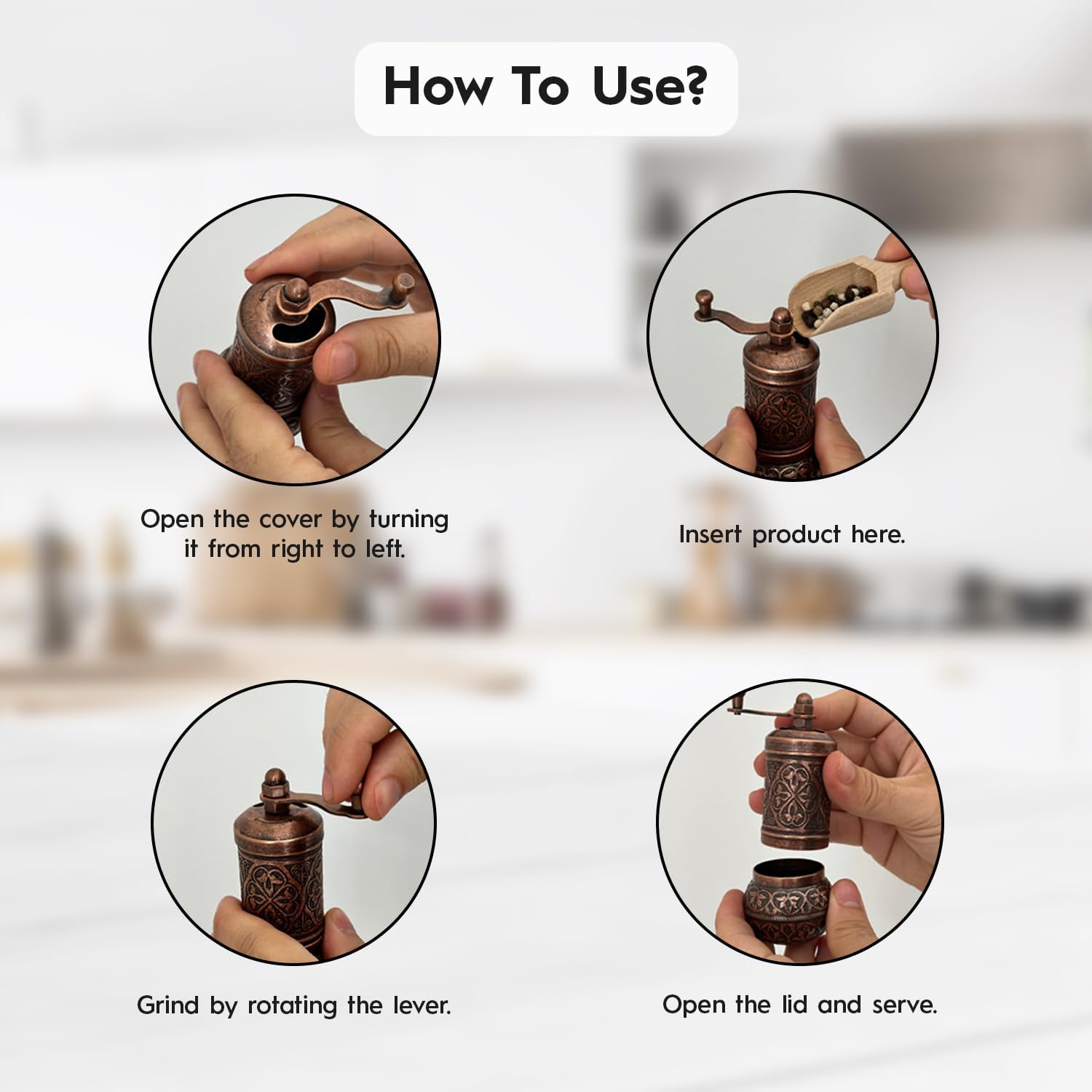 Handmade Decorative Black Pepper Grinder, Refillable Turkish Spice Mill Manual Pepper Mill with Handle, Spice Grinder Metal with Hand Crank 11 cm-4.3 inch