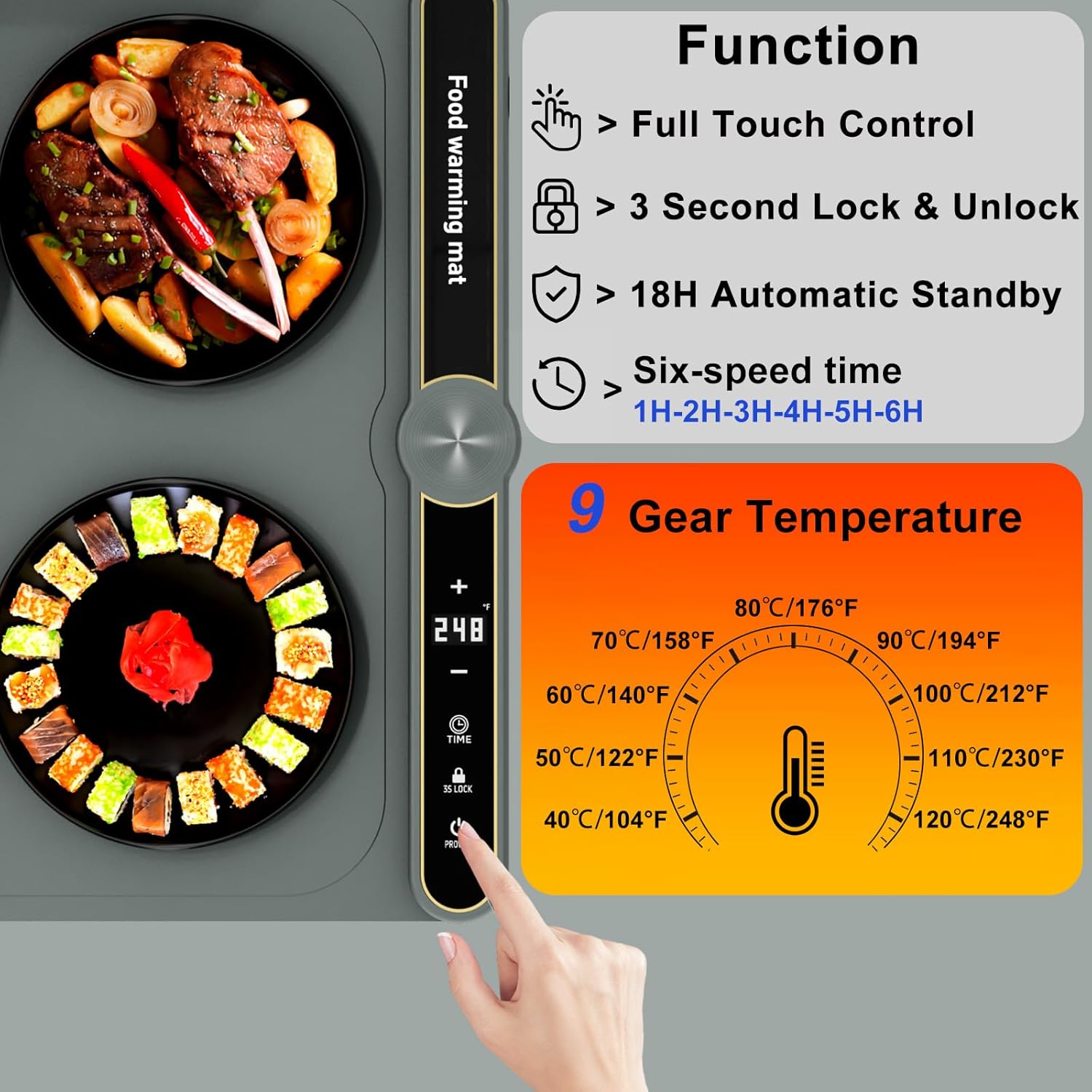 - Variety of Functions: This rollable food warmer mat features has 9_level adjustable temperature from 104℉ to 248℉ (40℃-120℃). Maximum 6-hour timing model and 18-hour auto shut-off timer. The touch screen design allows you to easily operate the food warm tray