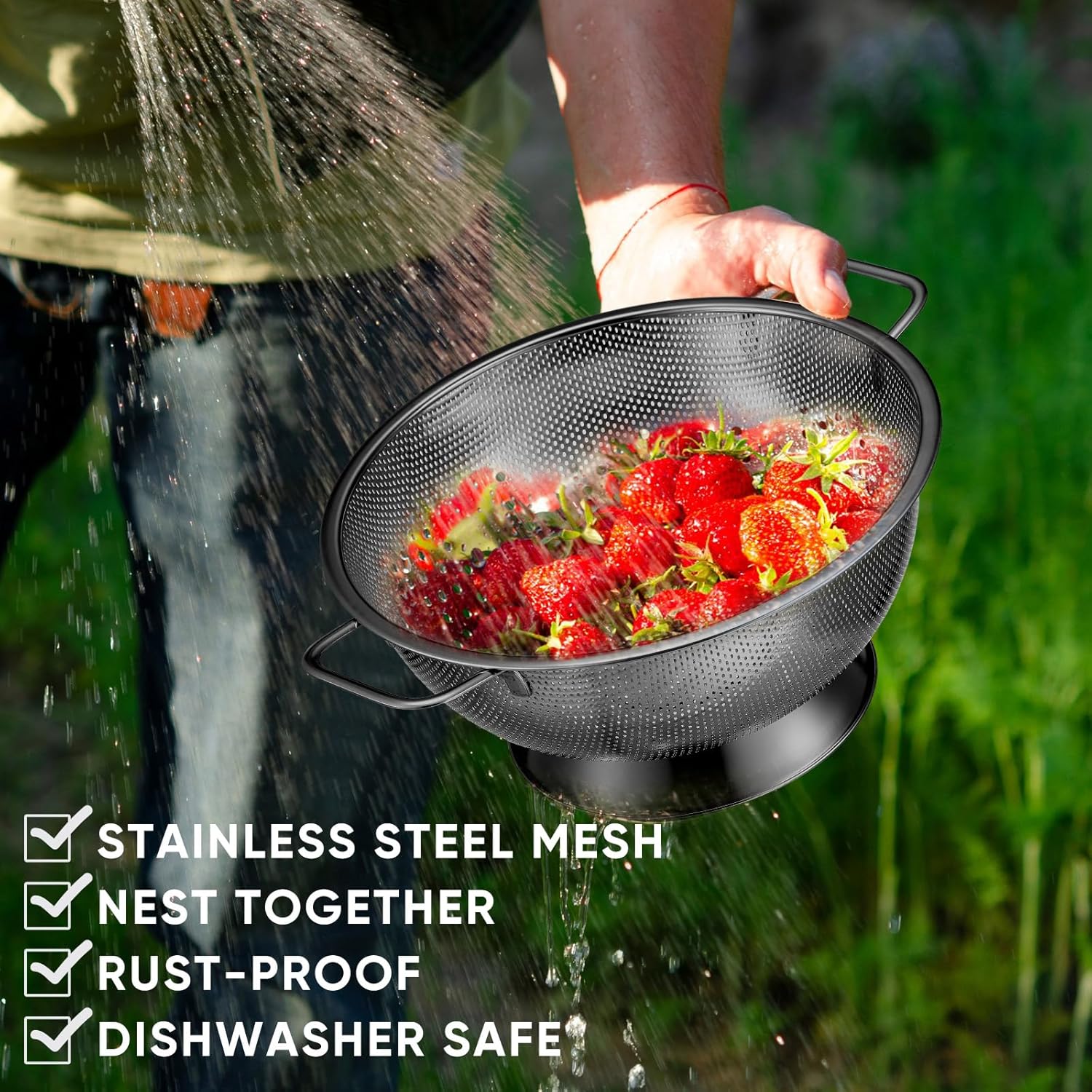 Bokon 3 Pcs Stainless Steel Colander Set Colander Bowl and Sieves 1/3/5 Quart Metal Mesh Strainer Net Basket with Handles Food Spaghetti Strainer for Kitchen Draining Pasta Rinsing(Black)