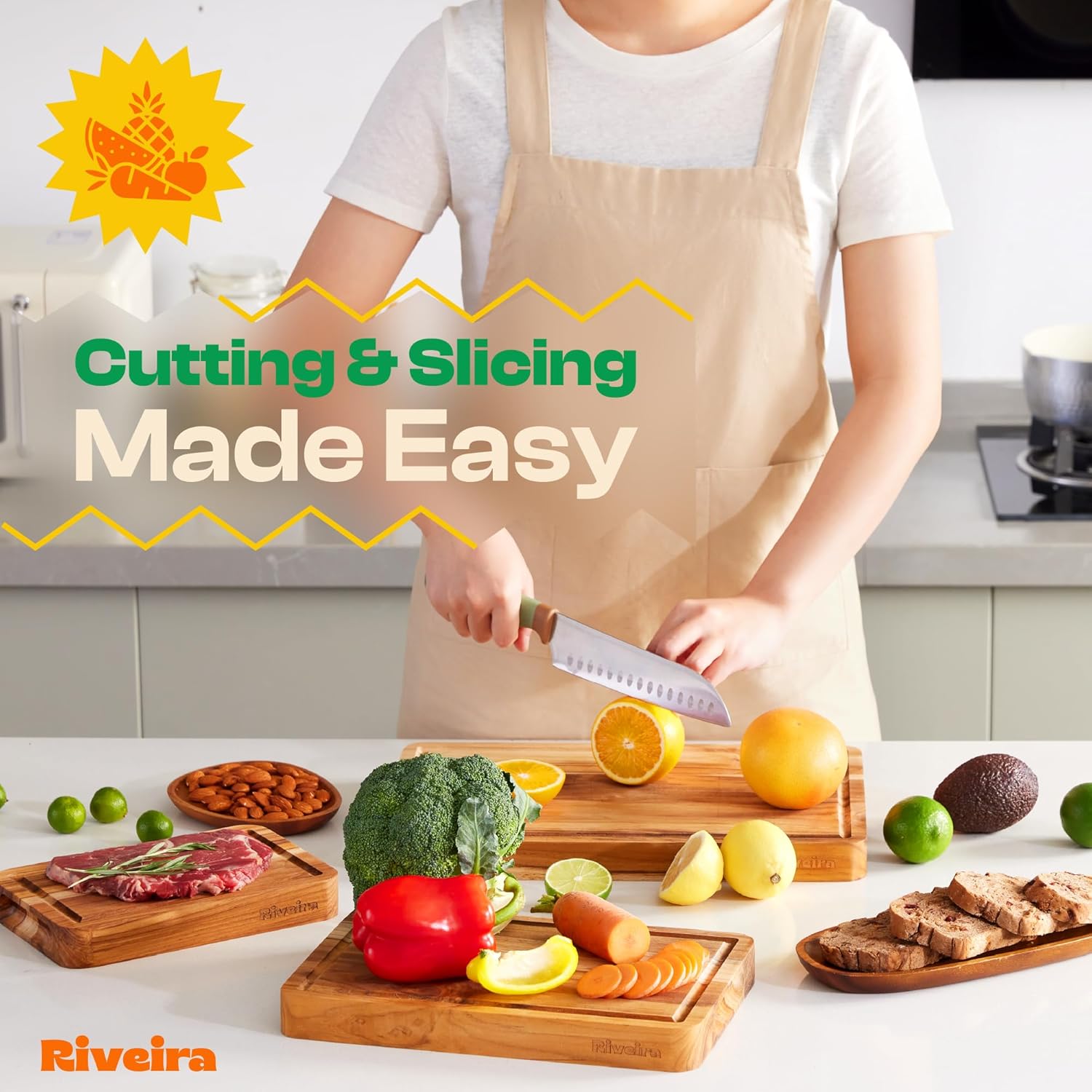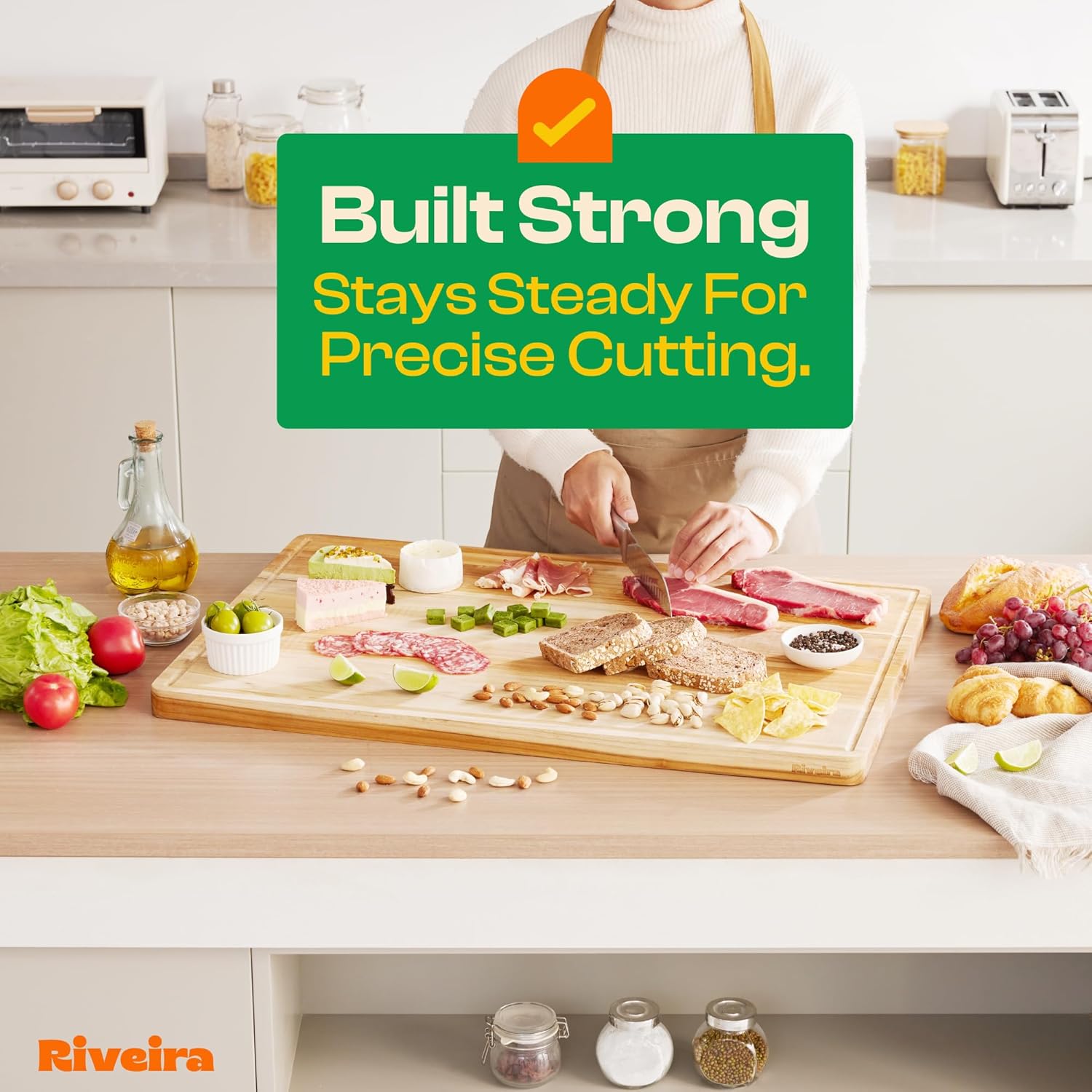 - Premium Crafted Teak — Take a detour from traditional kitchen aesthetics with this teak wood board crafted from 100% natural teak. Beyond being an unconventional and eco-friendly choice, the chopping board wood proudly showcases the environment friendly and organic teak. This wood cutting boards for kitchen counter adds an unexpected touch of confidence and style to your once-orderly culinary space. Riviera's wooden chopping boards for kitchen will be there for you for many years to come.