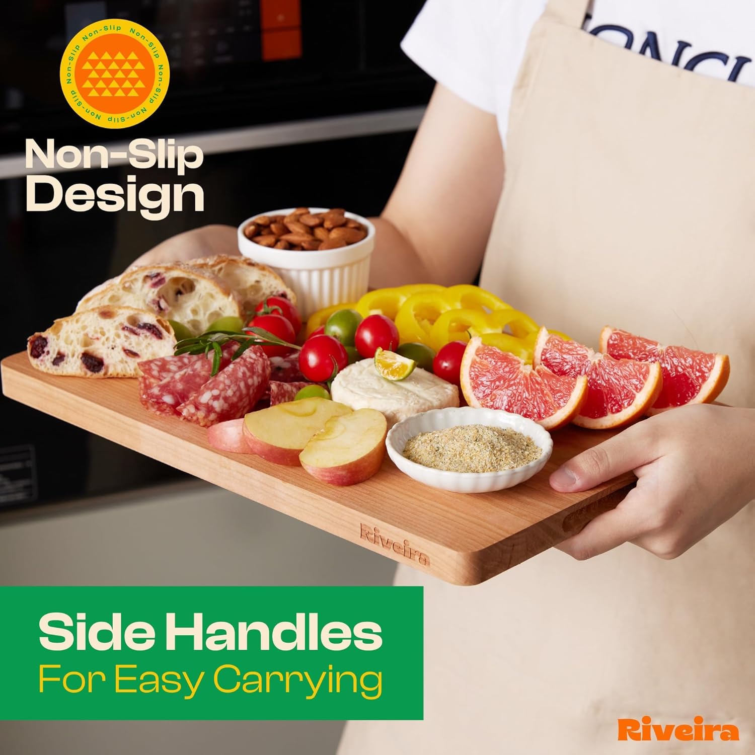 - No Mess Cutting and Transfer — Enjoy a mess-free kitchen with our large cherry cutting board. Equipped with deep juice grooves, these cutting boards for kitchen wooden catch liquid runoff from meat, fruit, and other ingredients, preventing spills and countertop messes. Whether you're working in an industrial restaurant kitchen or your home, this end grain cutting board cherry makes cleanup a breeze. Transfer ingredients from your prep station without any fuss with Riveira large cutting boards.