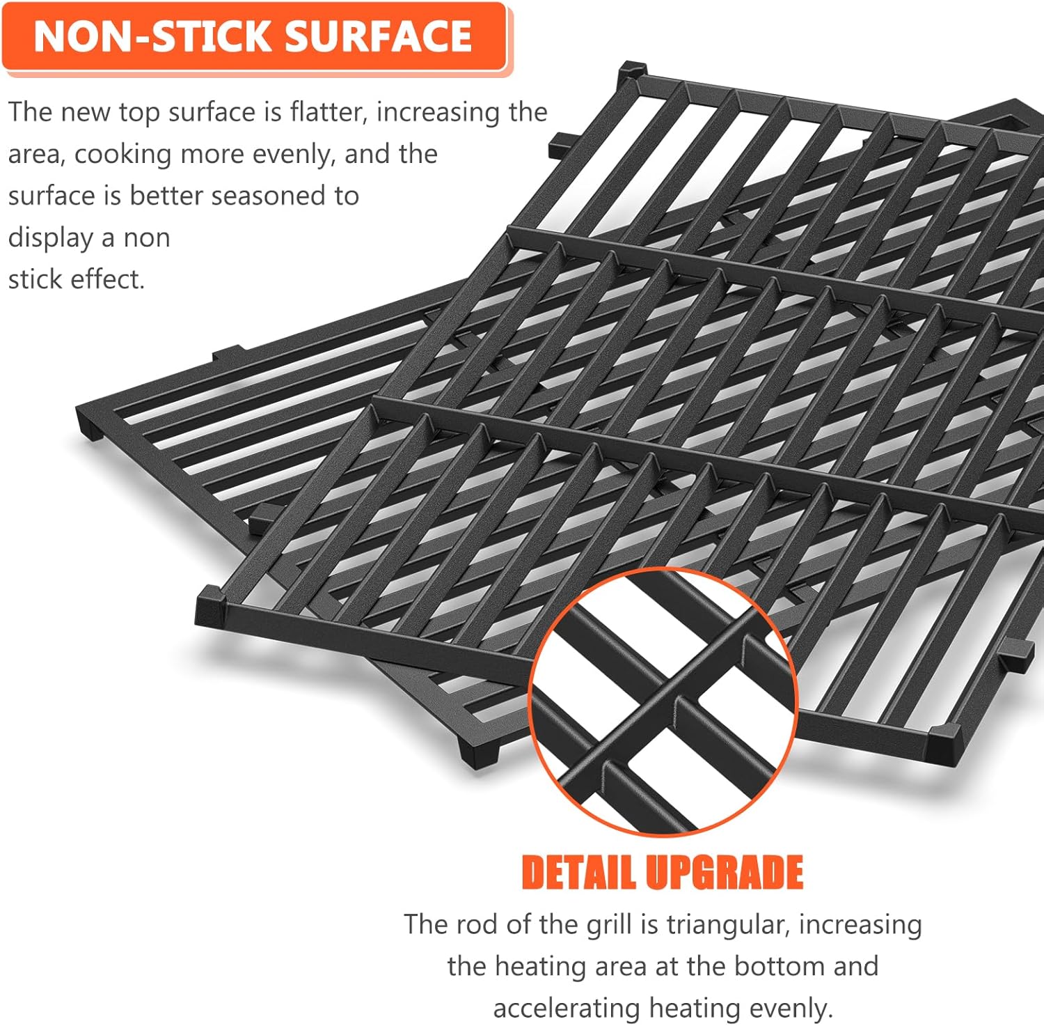 - 🔥【Non Stick】When maintained properly by oiling after each use, these cast iron grill grates for the Weber Genesis 300 grill offer outstanding non-stick properties, ensuring your food cooks to perfection every time. The new-style flat wide slat design of the Weber Genesis grates features a flatter top and smaller gaps between rod bars. This prevents food from falling through and improves heat distribution for more even cooking