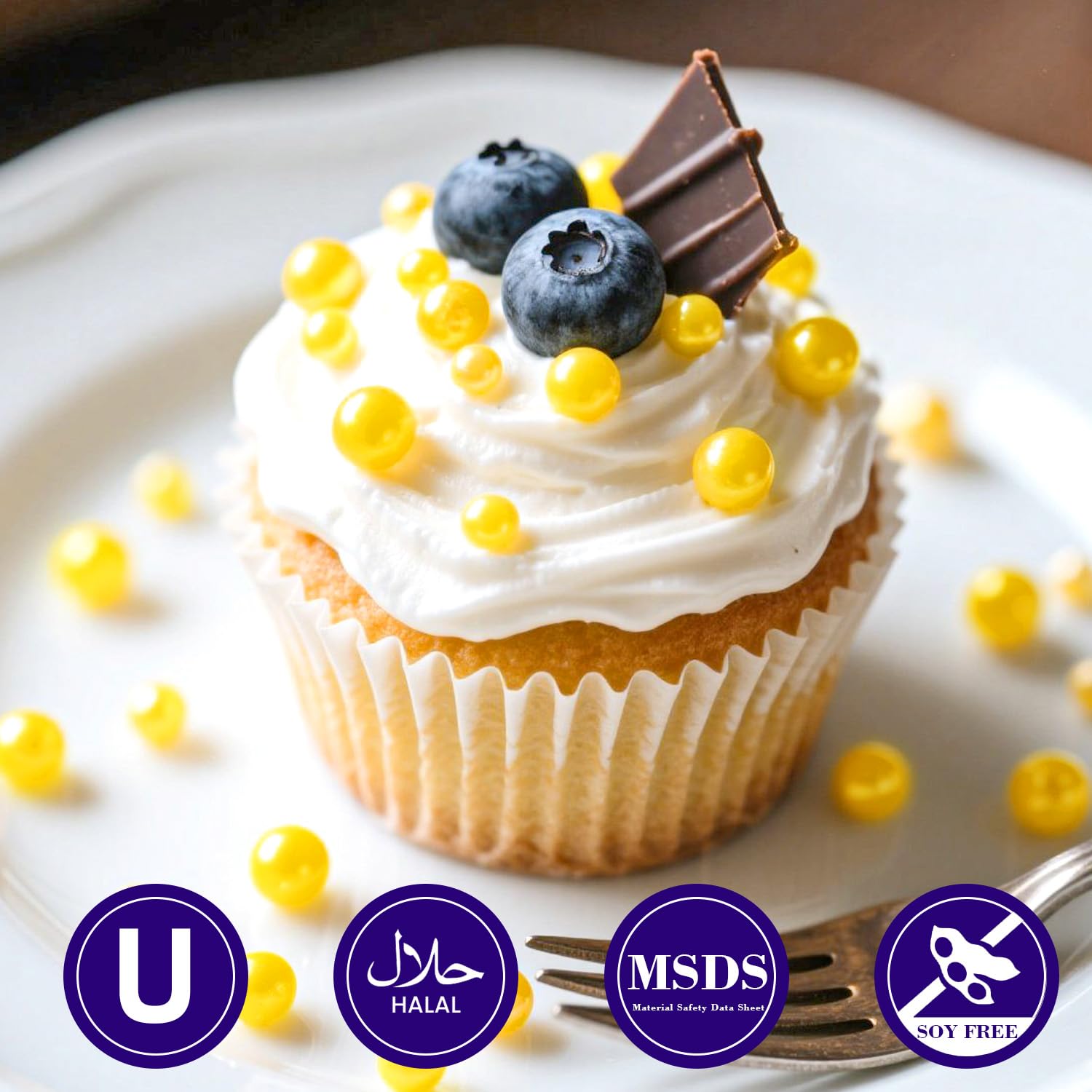 - Edible Yellow Pearl Sprinkles with food-grade raw materials. Preservative Free, Nut Free, Dairy Free, Chemical Free, Soy Free, Non-GMO. Produced using food-safe standards, the process does not come into contact with allergenic substances and uses Tamper-proof food label. Have Kosher and Halal Certification.