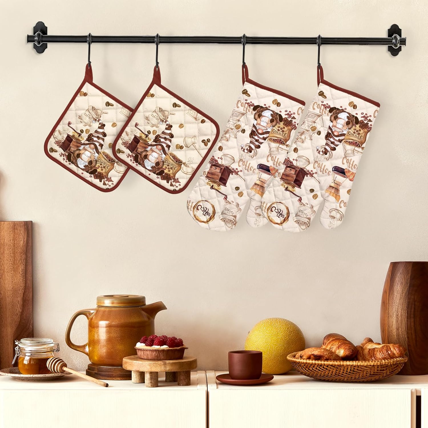 Coffee Gnome Oven Mitts and Pot Holders Sets 4Pcs, 100% Cotton Heat Resistant, Extra Long Oven Gloves Potholder for Kitchen Cooking Baking Decoration