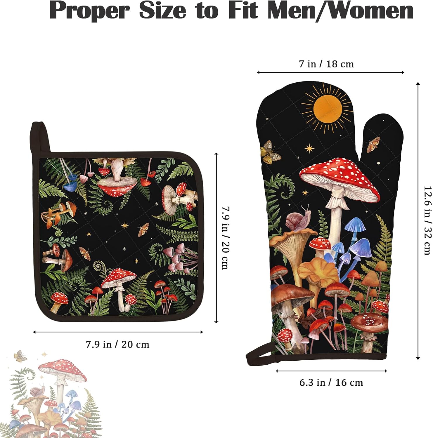 Mushroom Grass Oven Mitts and Pot Holders Sets 2Pcs, 100% Cotton Heat Resistant, Extra Long Oven Gloves Potholder for Kitchen Cooking Baking Decoration