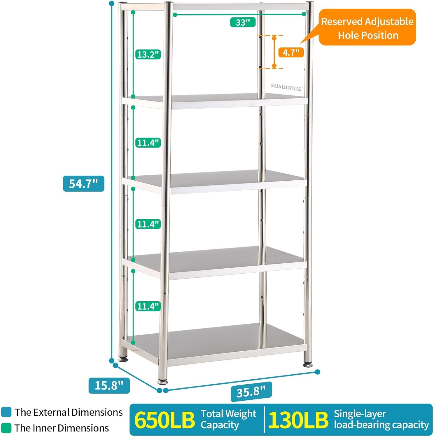 susunnus 5-Tier Stainless Steel Shelf, Heavy Duty Shelving for Kitchen, Garage, Industrial Storage, Kitchen Shelves Adjustable Feet, Easy to Clean (5T-35.8in*15.8in(Without guardrails))