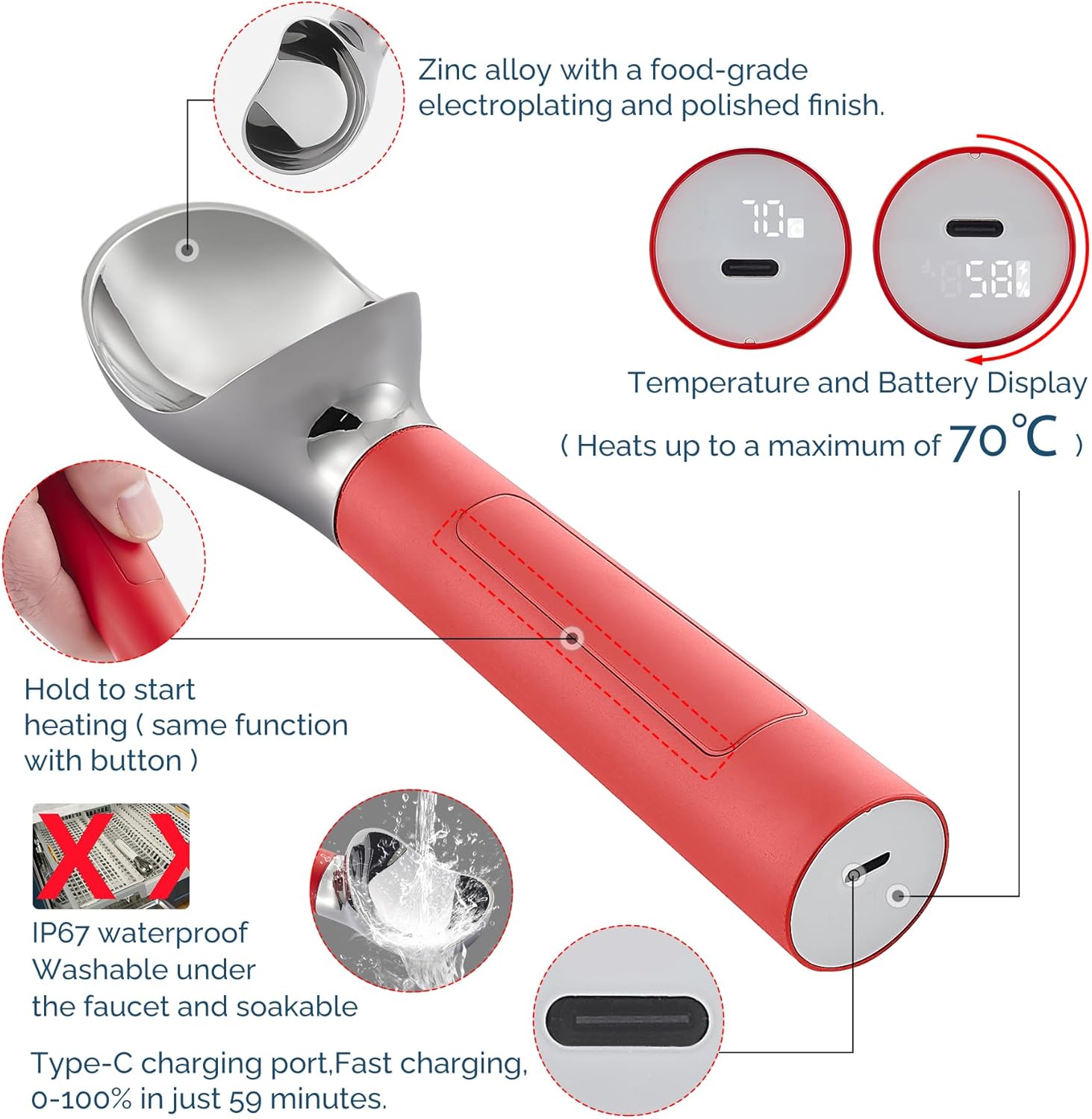 Heated Ice Cream Scoop Rechargeable, Electric Warming Ice Cream Scooper with LED Display, Heats to 158°F for Hard Ice Cream, Easy for Seniors & Kids, IP67 Waterproof (Red, 2 oz)