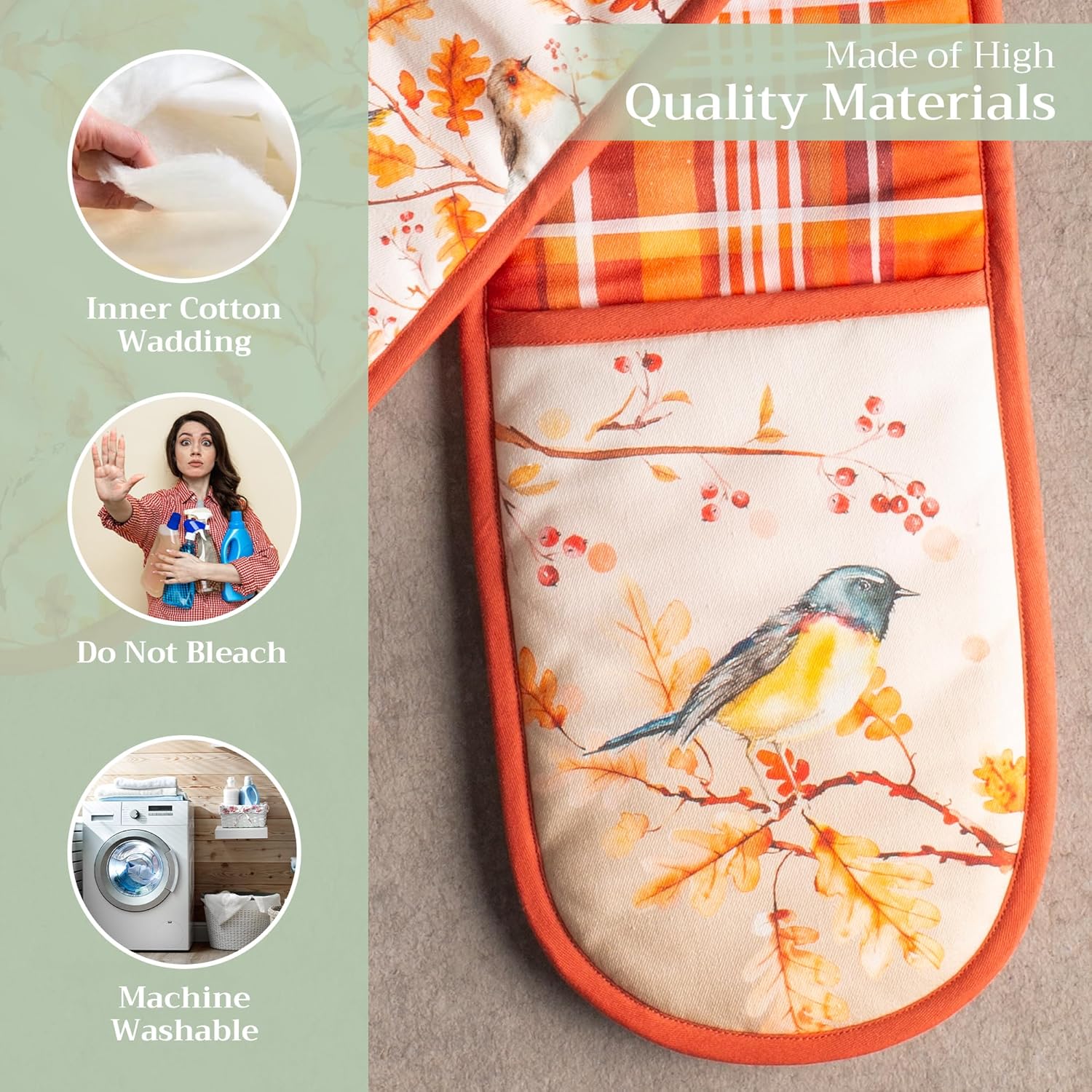 Maison d' Hermine Double Oven Mitt 100% Cotton Heat Resistant Cooking Gloves with Loop, Baking Barbeque, Handling Hot Pan, Oak Leaves - Thanksgiving/Christmas (7 Inch x 35 Inch)