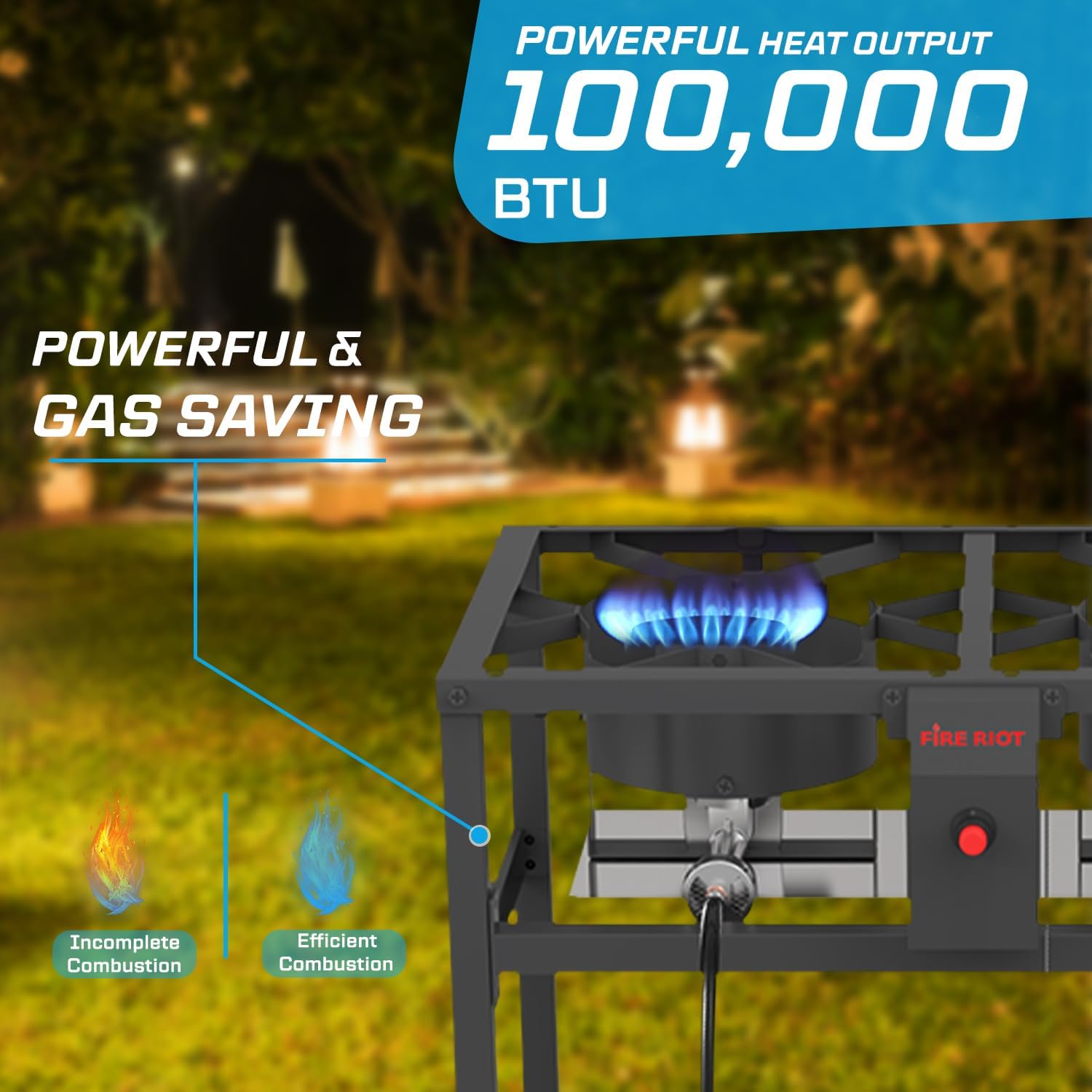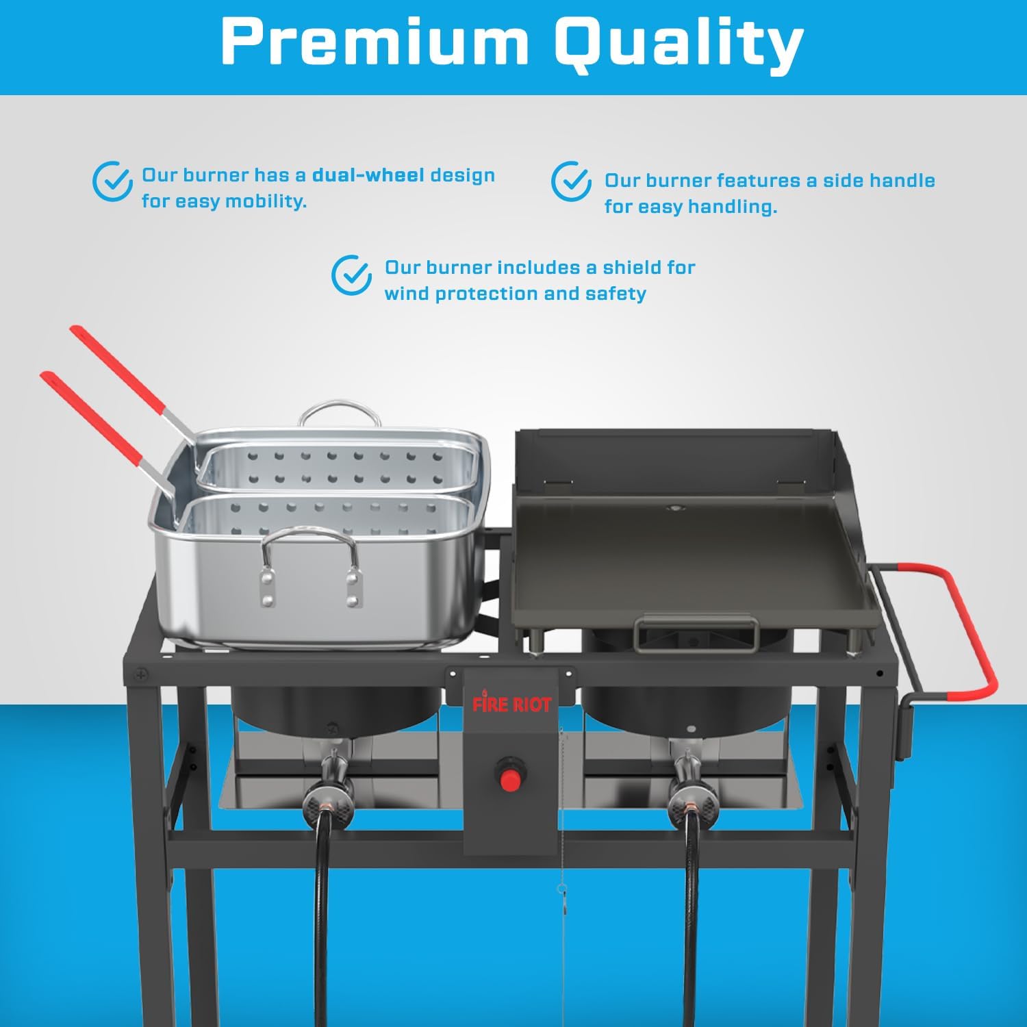 - HIGH COOKING POWER - 100,000 BTU OUTPUT: Experience the unmatched cooking power of our propane fryer and griddle combo, boasting a remarkable high-pressure burner with 100,000 BTU heat output and making it easier than ever to achieve perfectly cooked meals. Whether you're frying golden, crispy chicken, grilling succulent steaks, or searing fresh vegetables, this unit allows you to cook faster and more efficiently, elevating your outdoor culinary adventures.