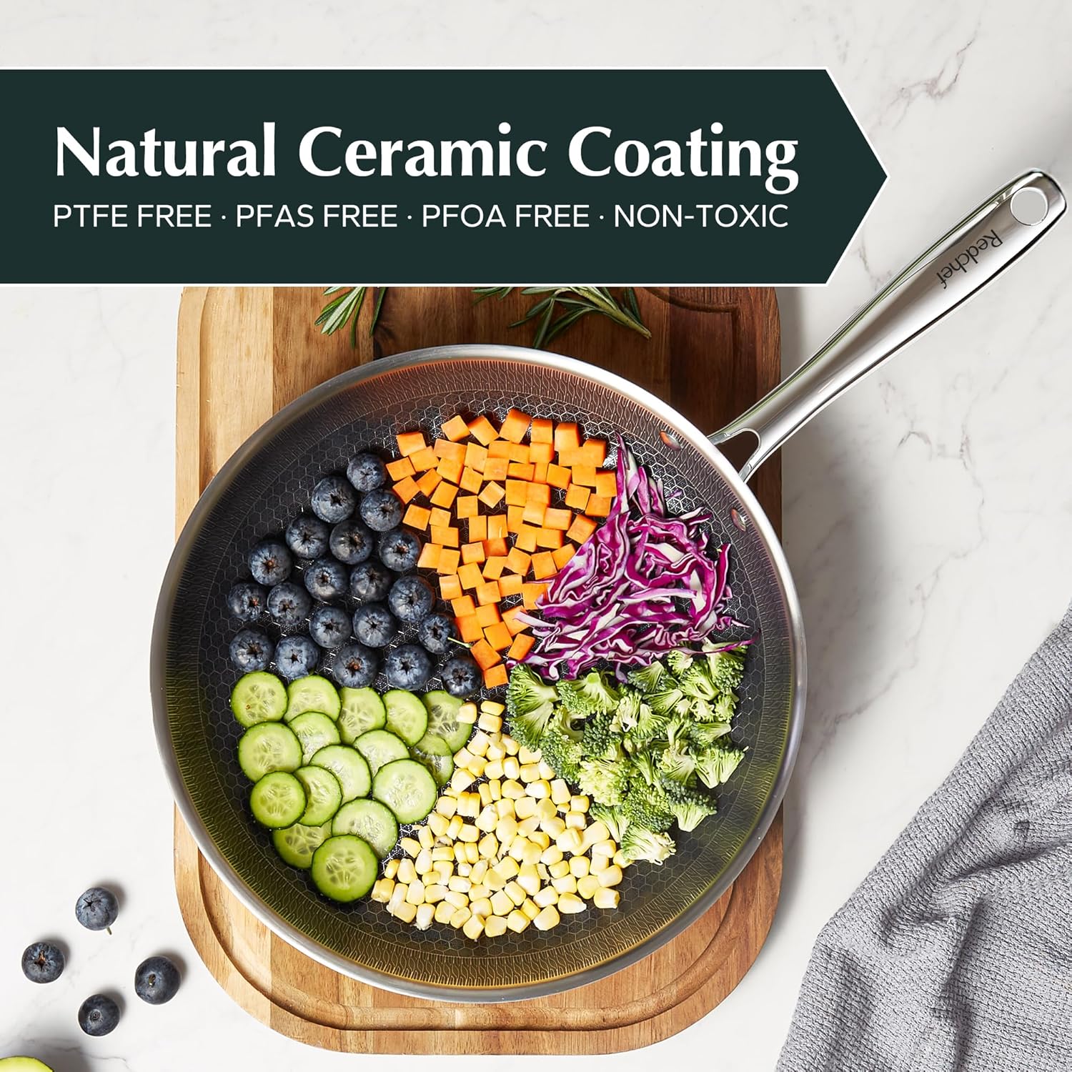 - Hybrid Honeycomb Structure: This innovative hybrid honeycomb structure offers superior non-stick properties, ensuring the ceramic coating remains intact and does not peel off, while effortlessly preserving the natural characteristics of food