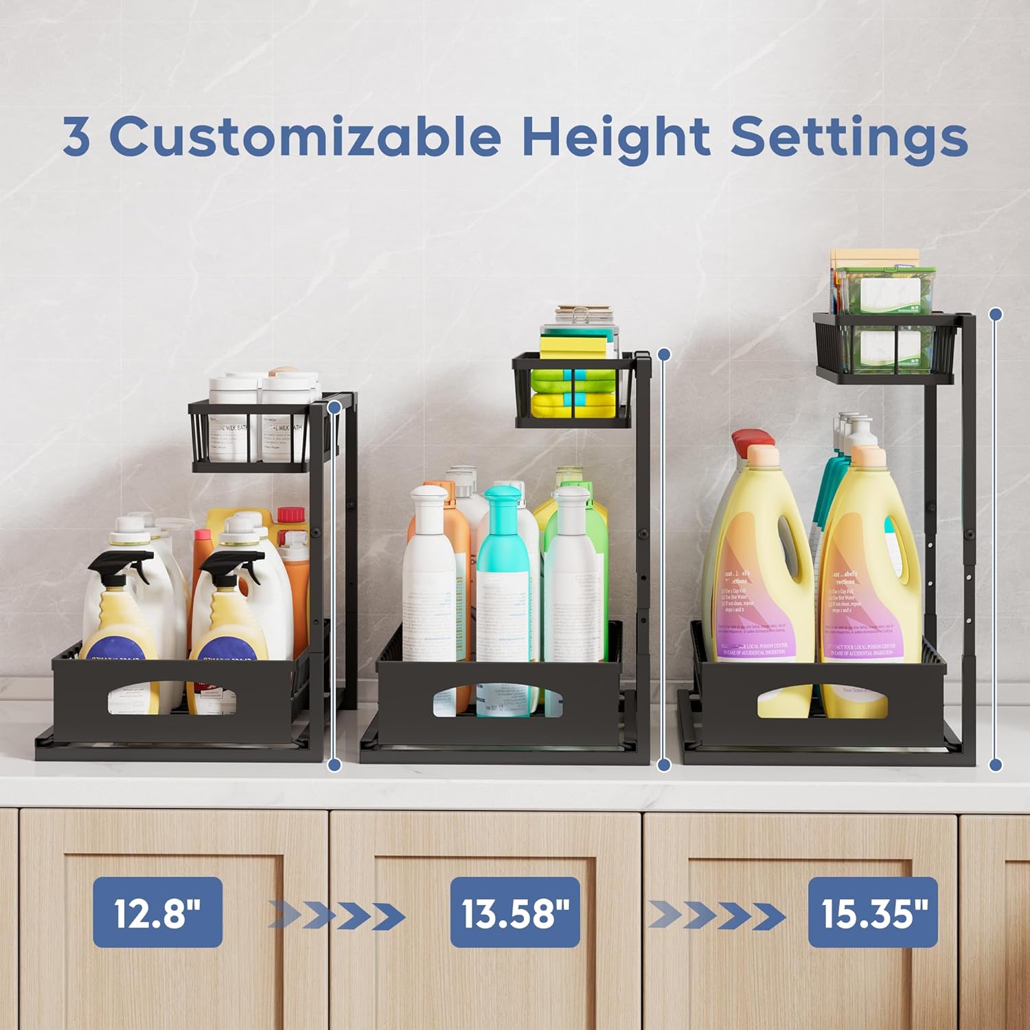 Under Sink Organizer, 2 Pack Height Adjustable Cabinet Organizer with Slide Out Drawer, Pull Out Under Sink Storage, Multi-Purpose 2 Tier Sink Shelves for Kitchen Bathroom Pantry (Black, 2 Pack)