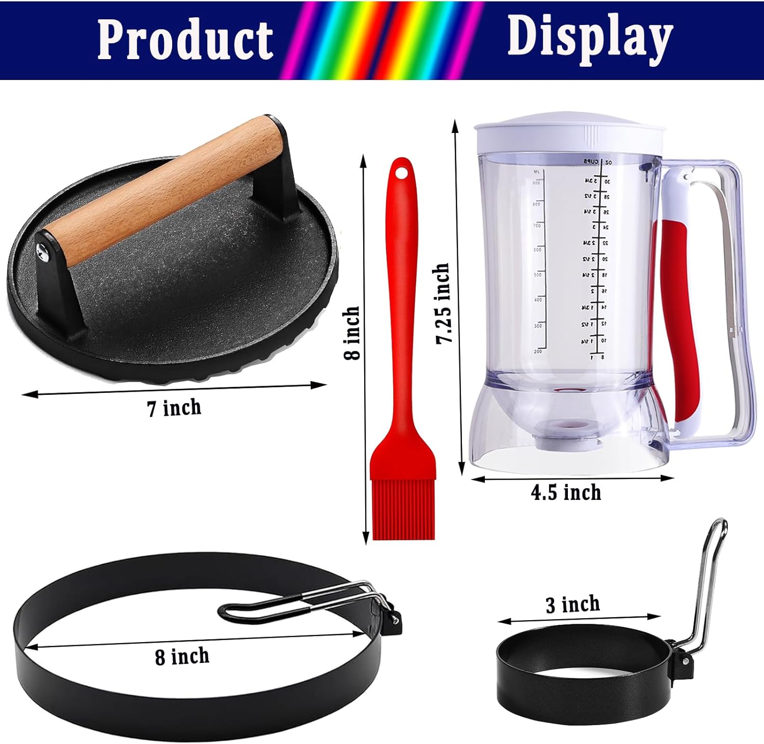 - 【Essential Grill Accessories Set】This new level breakfast set includes pancake dispenser, bacon press,basting brush,egg rings, and an additional extra-large 8" omelet ring.