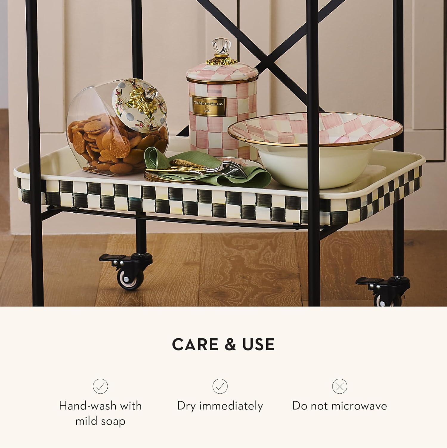 MACKENZIE-CHILDS Enamel Salad Serving Set, Enamel Bowl and Wooden Salad Servers, Decorative Kitchen Set, Pink-and-White Rosy Check