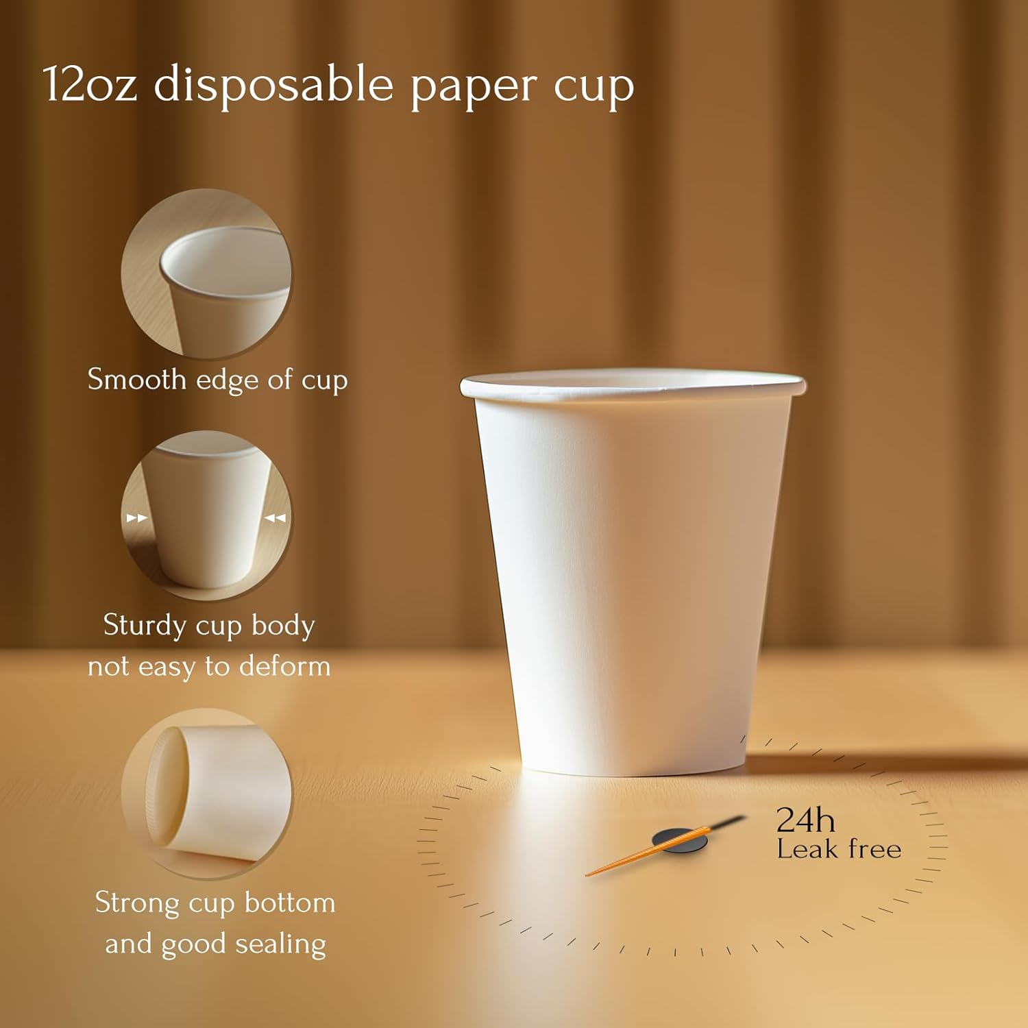 Paper Coffee Cups, 12 OZ Disposable Hot and Cold Cups, Leak-Proof White Cups for Coffee, Tea, Ideal for Home, Office, and Events (100 Count)