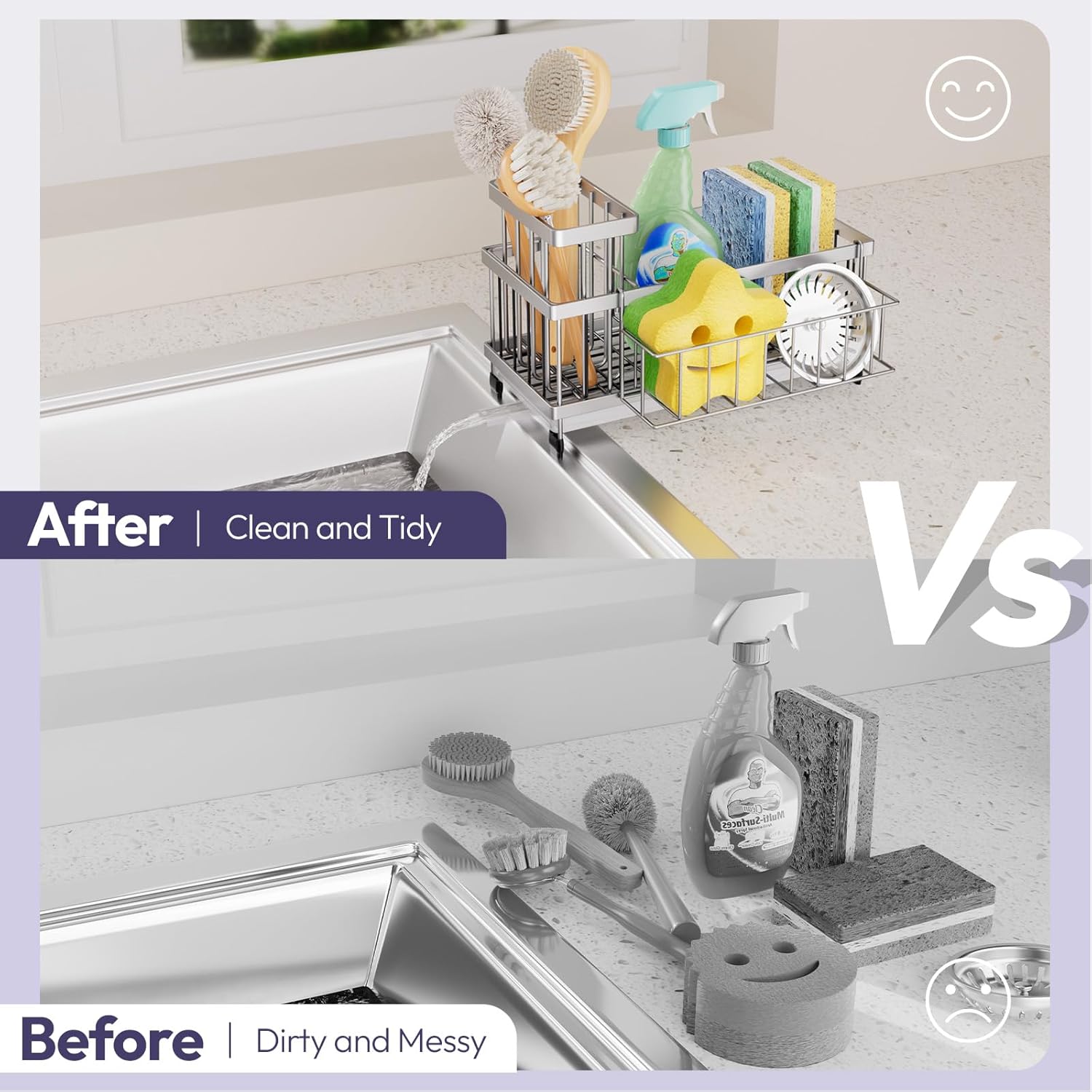 - [360° Self-draining Tray] This sink caddy features a smart 360° self-draining tray that channels excess water straight into the sink—no puddles, no fuss. Say goodbye to soggy counters and hello to a clean, dry kitchen with our sponge holder for kitchen sink system that works like a charm for daily use