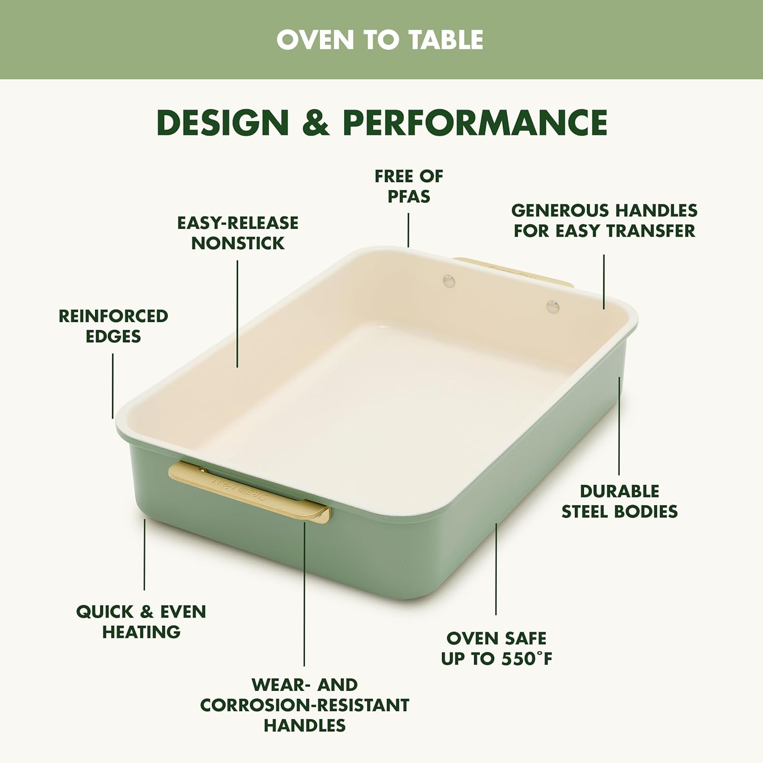 GreenPan Bakeware Rectangular Cake Pan, Ceramic Nonstick Baking Pan, PFAS & BPA Free, Gold Handles, Durable Steel, Freezer to Oven Dish, Scratch Resistant, Bake & Roast Ovenware, Sage Green