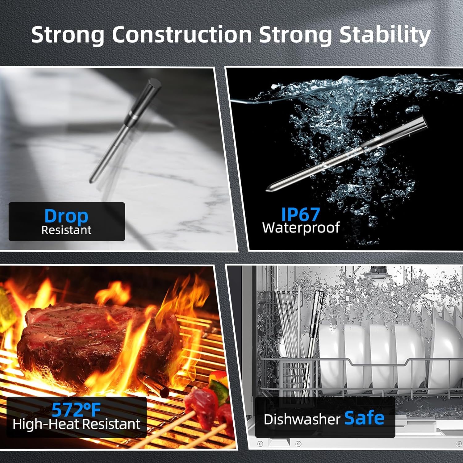 - 【Dual-Sensor Precision & Durable Food-Grade Design】The Aurasky wireless meat thermometer features dual sensors and a high-temperature safety line, delivering precise temperature readings to prevent overcooked or undercooked meals. Built to last, it boasts an IP67 waterproof rating and exceptional thermal shock resistance, making it ideal for grilling, frying, and other high-heat cooking methods. Crafted with a ceramic handle and an FDA 316 stainless steel probe, this cooking thermometer is made from food-grade materials, ensuring both safety and durability for all your culinary adventures