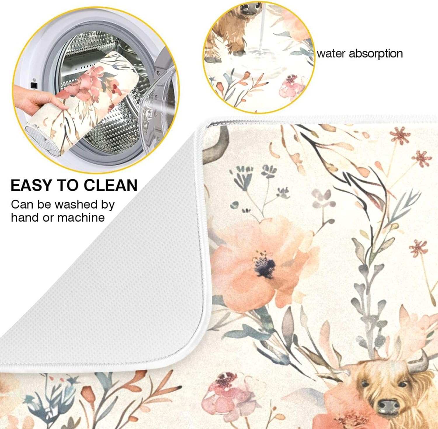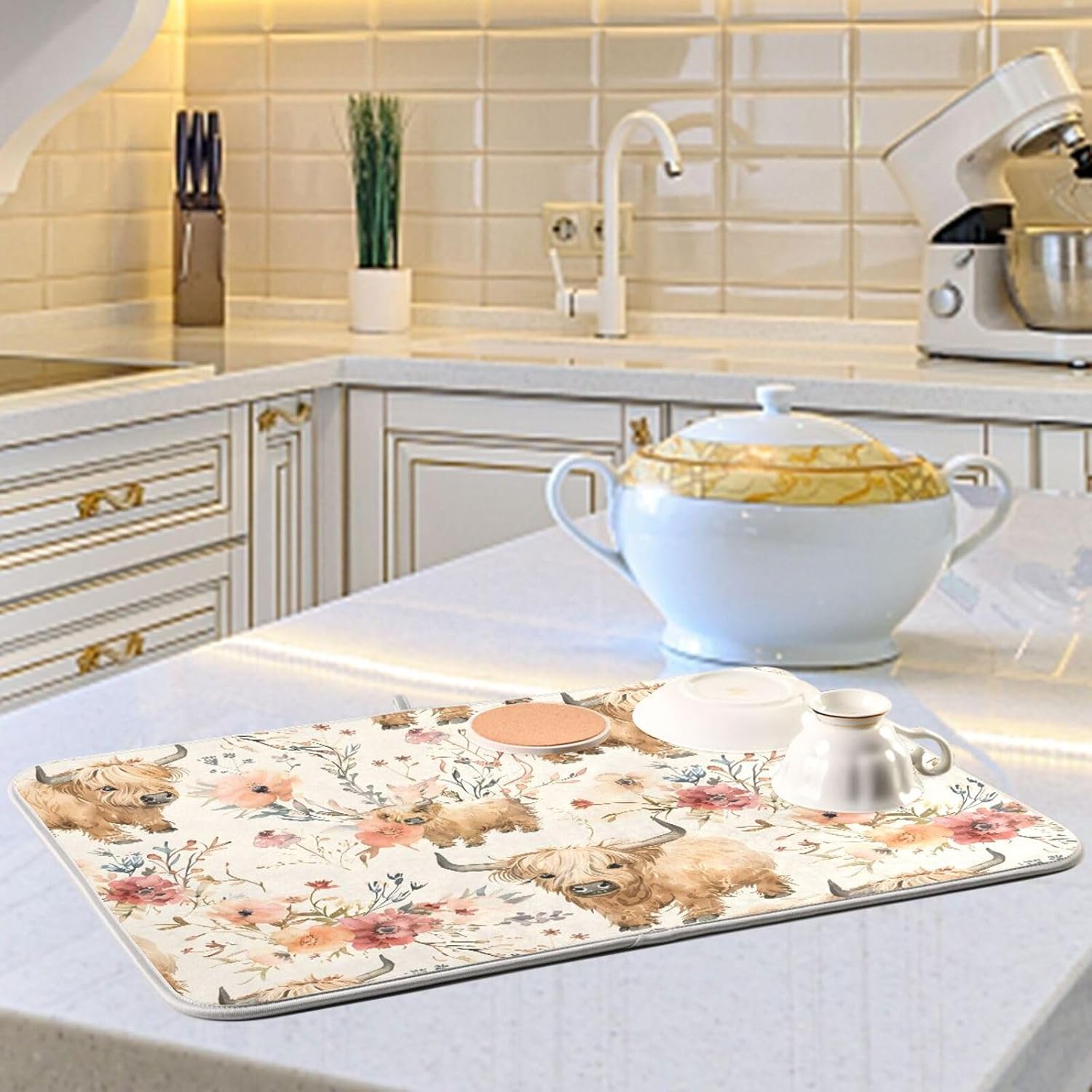 Cute Highland Cows Flowers Dish Drying Mat for Kitchen Counter Absorbent Microfiber Drying Pad, Large 18x24 in, Reversible Drainer Mats