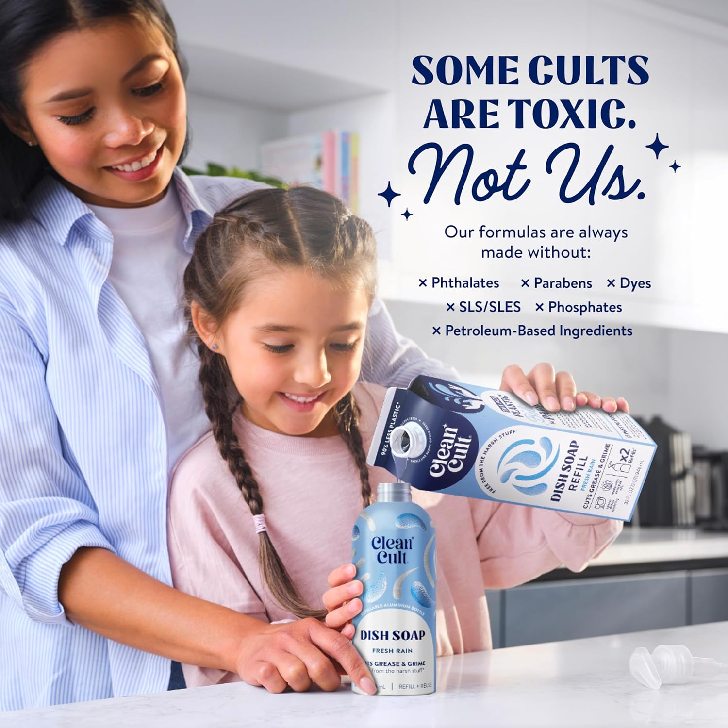 Cleancult Dish Soap Liquid Refill (32oz, 3 Pack) - Plant Based Cleaning Power - Dish Soap that Cuts Grease & Grime - Free of Harsh Chemicals - Uses 90% Less Plastic - Fresh Rain