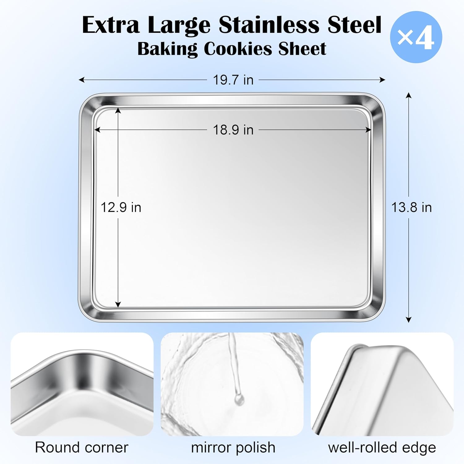 E-far Large Baking Sheets Set of 4, 20”x14” Stainless Steel Cookie Sheet Pans for Oven, Non Toxic Big Metal Baking Tray for Cake Cookies, Healthy & Rust Free, Mirror Finish & Dishwasher Safe