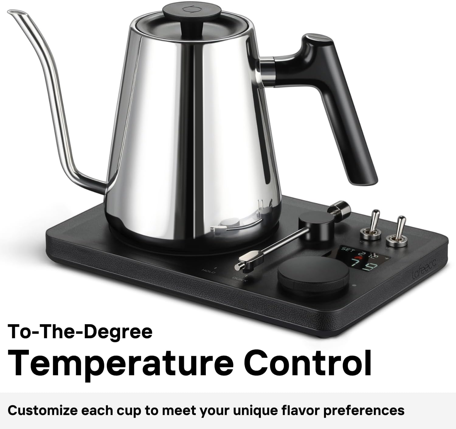 - THE DJ KETTLE - The Lafeeca DJ Pour Over Electric Kettle combines modern turntable-inspired aesthetics with high-performance functionality. Designed for both style and efficiency, its 0.9-liter capacity makes it an essential appliance for daily coffee and tea brewing.