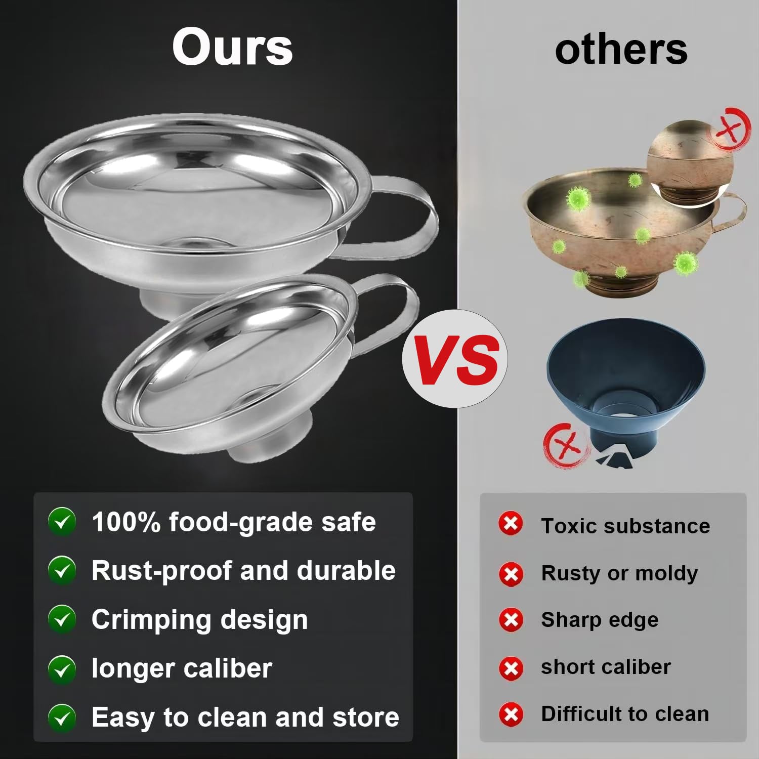 - Quality Stainless Steel Wide Mouth Canning Funnel - Compared to traditional plastic funnel sets, made of food-grade strong stainless steel, BPA-free and also resistant to breaking, bending, scratching, will help you transfer any liquid smoothly for a long time to come.