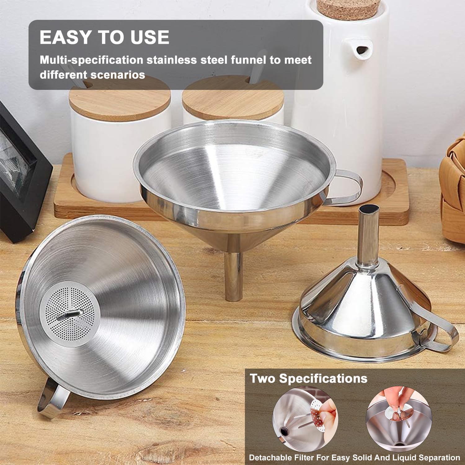- [Narrow stem design] Funnels for kitchen use filling bottles,Tapered spouts target narrow containers: essential oil droppers, spice jars,Reinforced rims prevent spills with bulk ingredients (coffee beans, rice). Includes 2 stainless steel strainers:Fine mesh (0.05” holes): Filters pulp from juices/herbal infusions,Medium mesh (0.2”holes): Sifts powdered sugar/catches herb stems