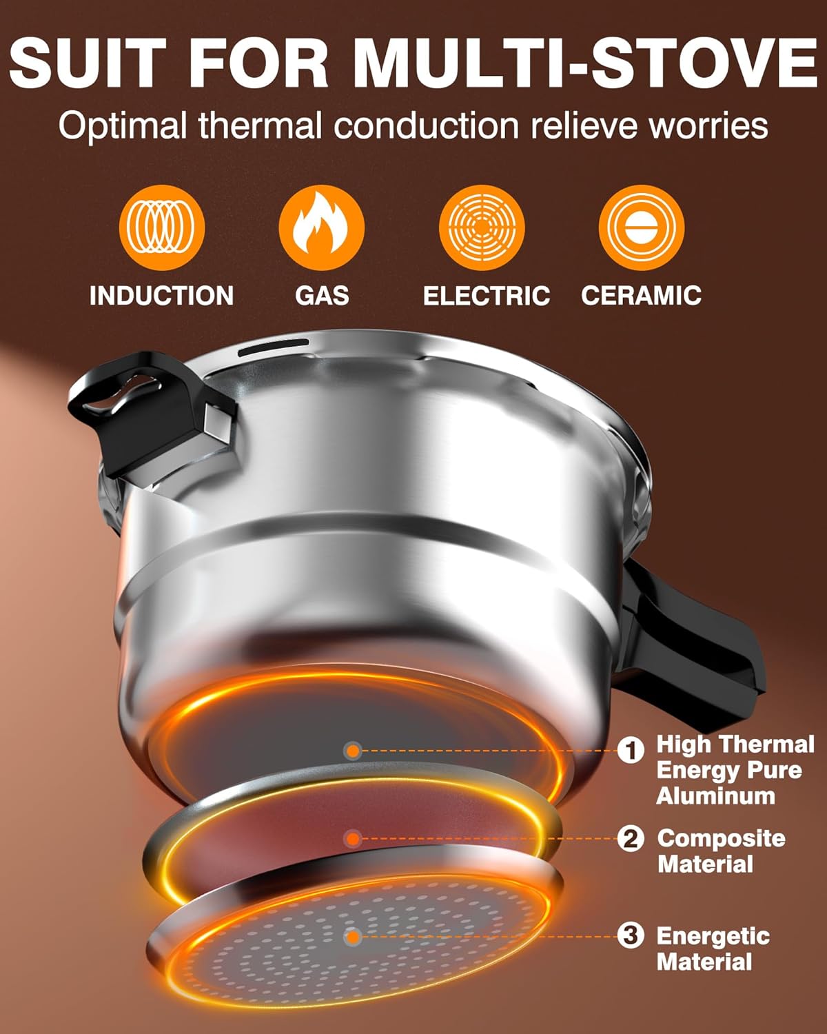 - ALL-PURPOSE COOKING POT: This safety pressure cooker is compatible with gas stoves and electric cooktops, suitable for all types of stoves. Perfect for making beans, meats, vegetables, soups, and more.
