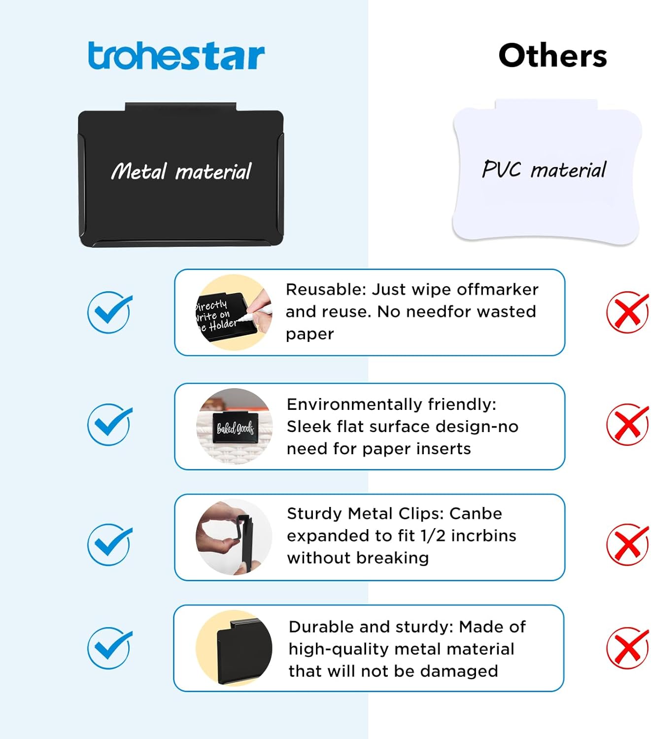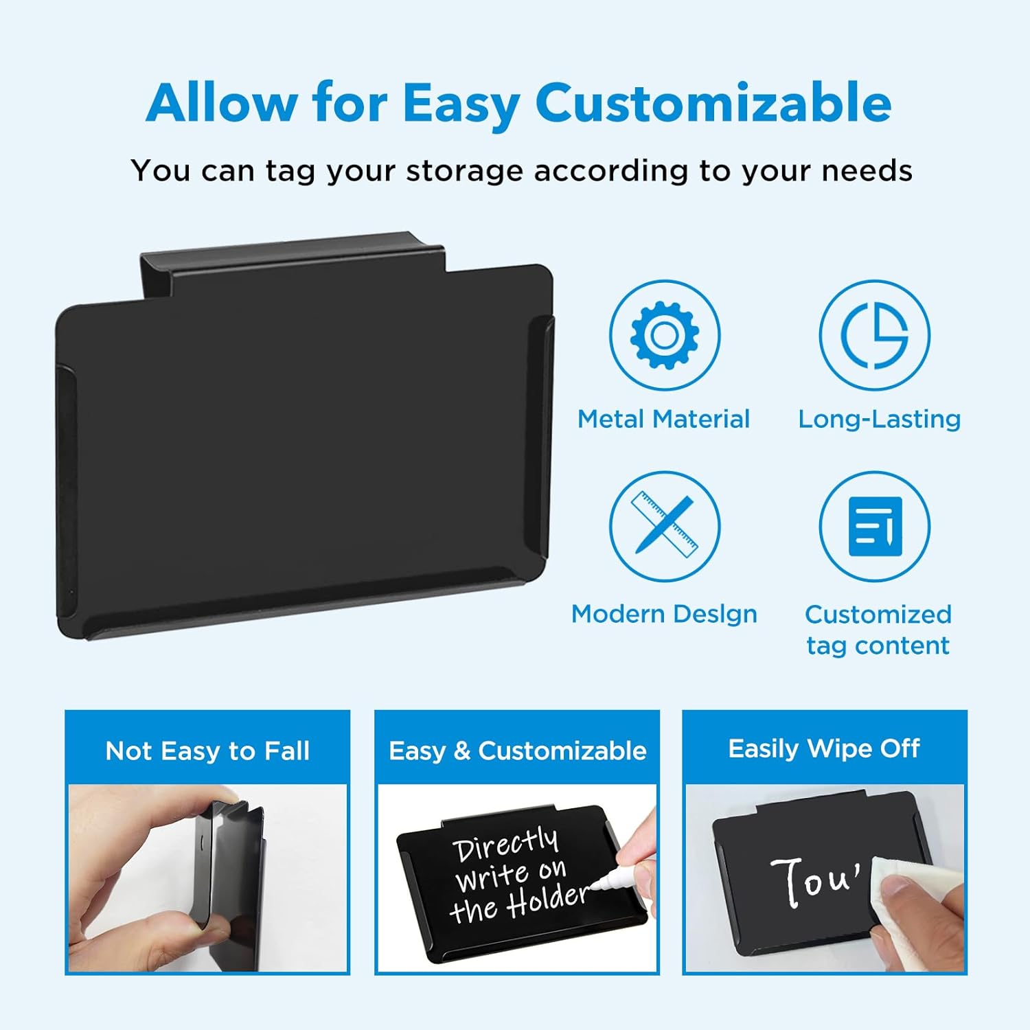 - PREMIUM & SMART PANTRY LABELS: Unique clip-on design is easily removable or repositionable. It is bendable to help you slip it over different types of storage bins, baskets, and boxes. Three lipped edges to help slide labels in and keep them in place. Made of premium metal and durable for a long time run. Its smooth surface provides better writing performance.